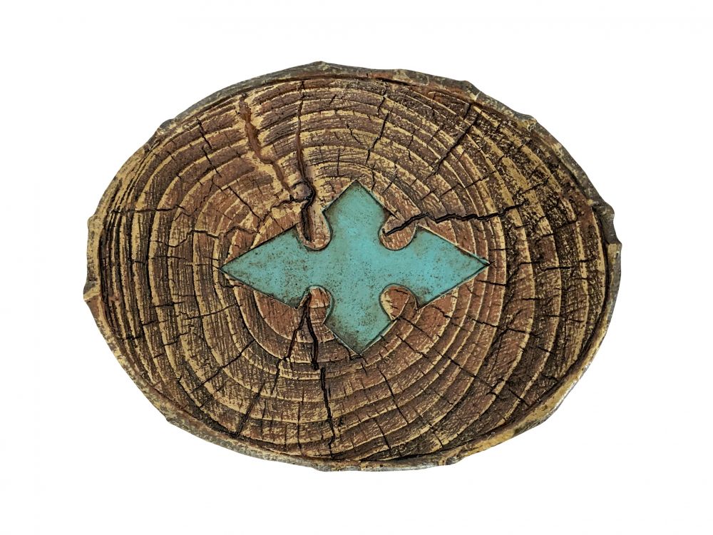 This stylish bathroom set features a western design on front with a teal inlay and a leather tussle. Set includes a toothbrush holder, cup, and a bar soap holder. Toothbrush holder comes with 4 slots for toothbrushes and toothpaste with a rubber drain stopper at the bottom for easy cleaning.