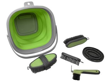 5 Piece grooming kit with collapsible bucket. Grooming kit comes with soft grip curry comb, hoof pick with brush, and 3 assorted styles of brushes and a collapsible bucket with handle. Bucket measures 7" tall and 5.5" wide at bottom and 11.5" wide at top.