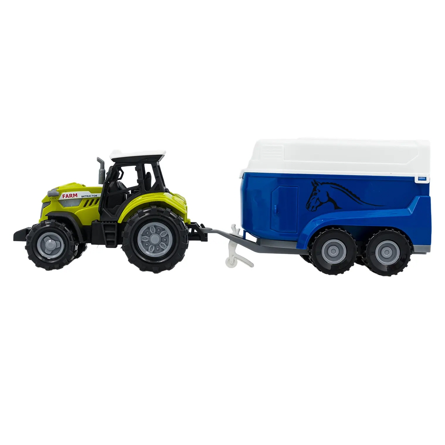 Includes: 1 horse, 1 farmer figure, 1 wheelbarrow, 1 trailer, 1 feeding trough, 3 fence panels, 3 barnyard tools, and logs