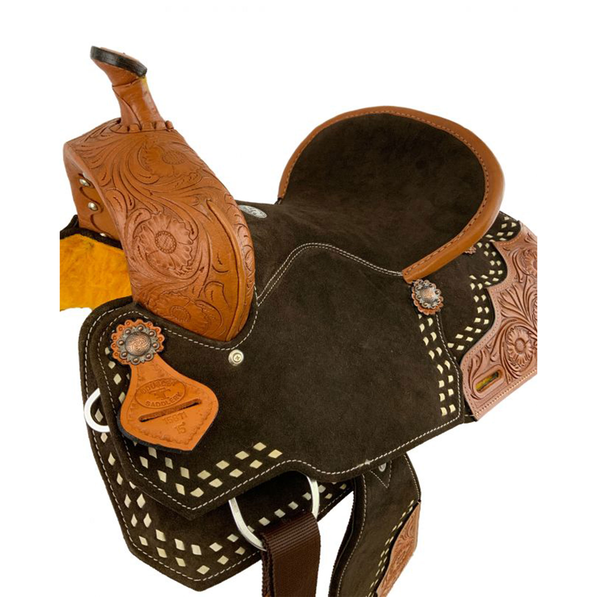 Turn heads and ride with confidence in the Double T® Floral Suede Barrel Style Saddle – 15 Inch. Built for both performance and eye-catching style, this saddle features a deep padded suede seat that keeps you secure through every turn and sprint. Brown suede jockeys, fenders, and skirts provide excellent grip, giving riders that locked-in feel while adding rich western character. Medium oiled floral tooling brings a classic barrel saddle look, perfectly balanced with crisp white buckstitched inlay for a bold pop of contrast.