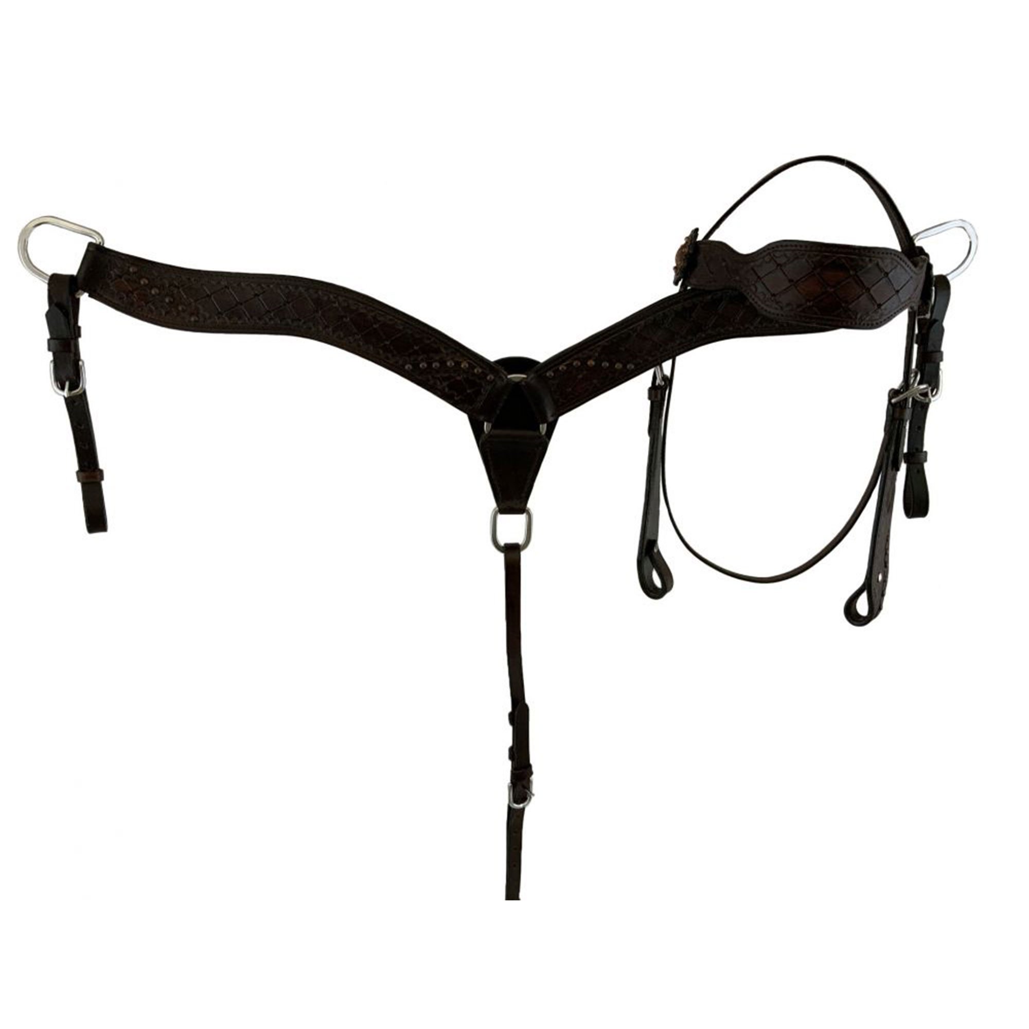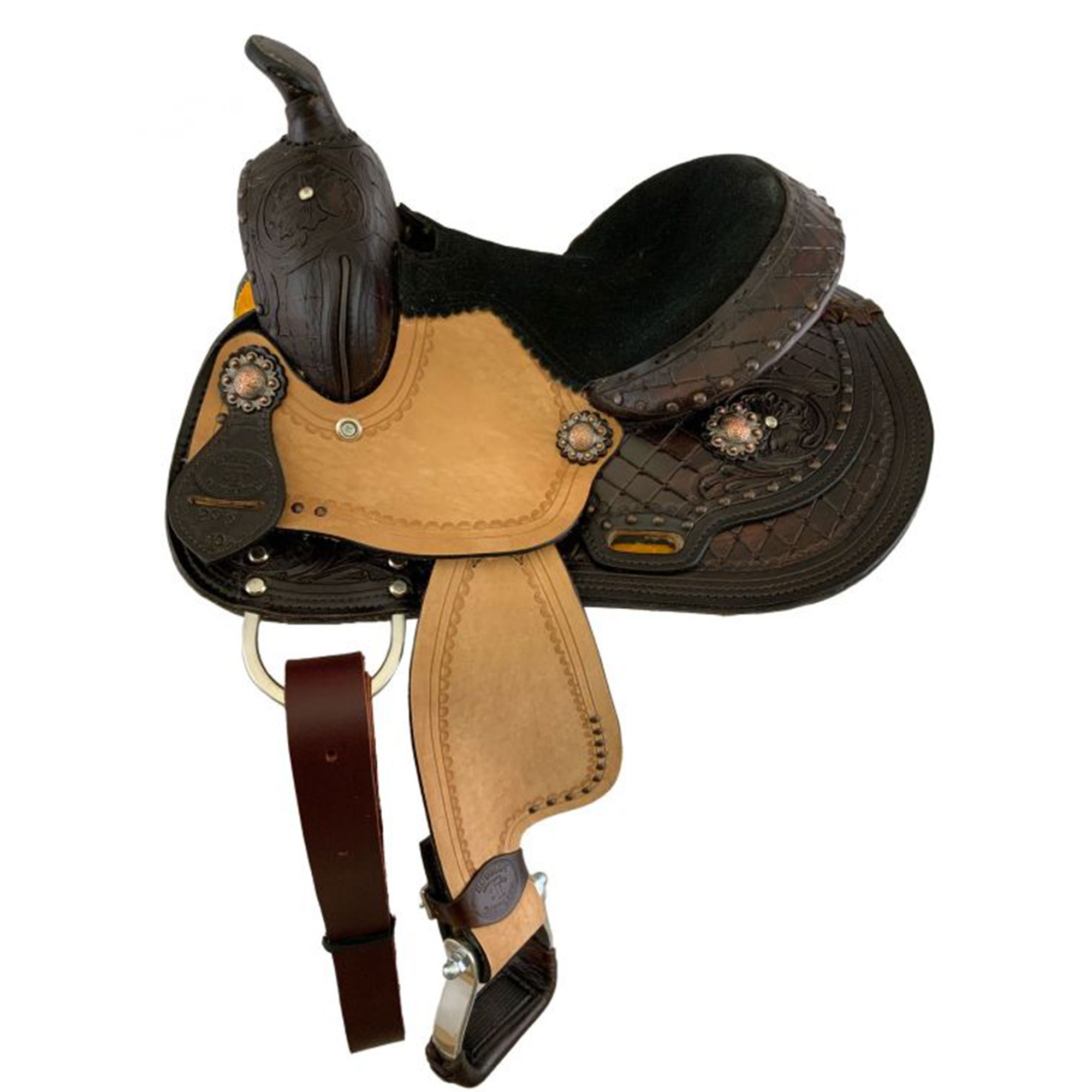 10" Double T pony saddle set with a large diamond tooling on the pommel, cantle, and skirt. Rough out fenders and jockey accented with a halfmoon stamping. Saddle is accented with copper engraved conchos, copper studs, and aluminum stirrups. This saddle set comes with a matching headstall, reins and breast collar.