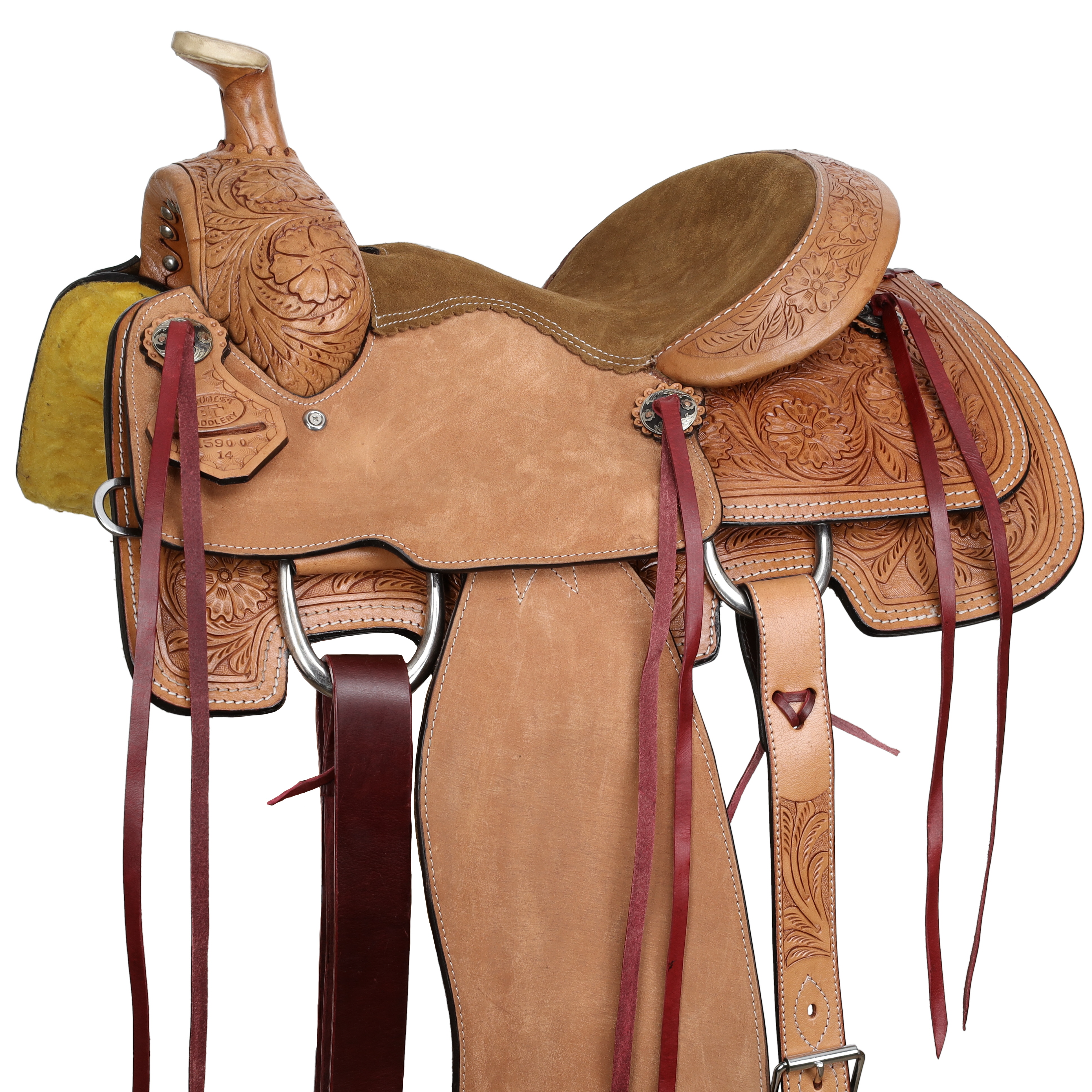 Designed for comfort and functionality, the honey brown suede padded seat provides a secure, comfortable ride, while silver bar antiqued slotted conchos paired with burgundy saddle strings add rich contrast and detail. Complete with a leather tie strap, off billet, and rear rigging, this saddle is ready for everyday roping, ranch work, or long hours in the saddle.
