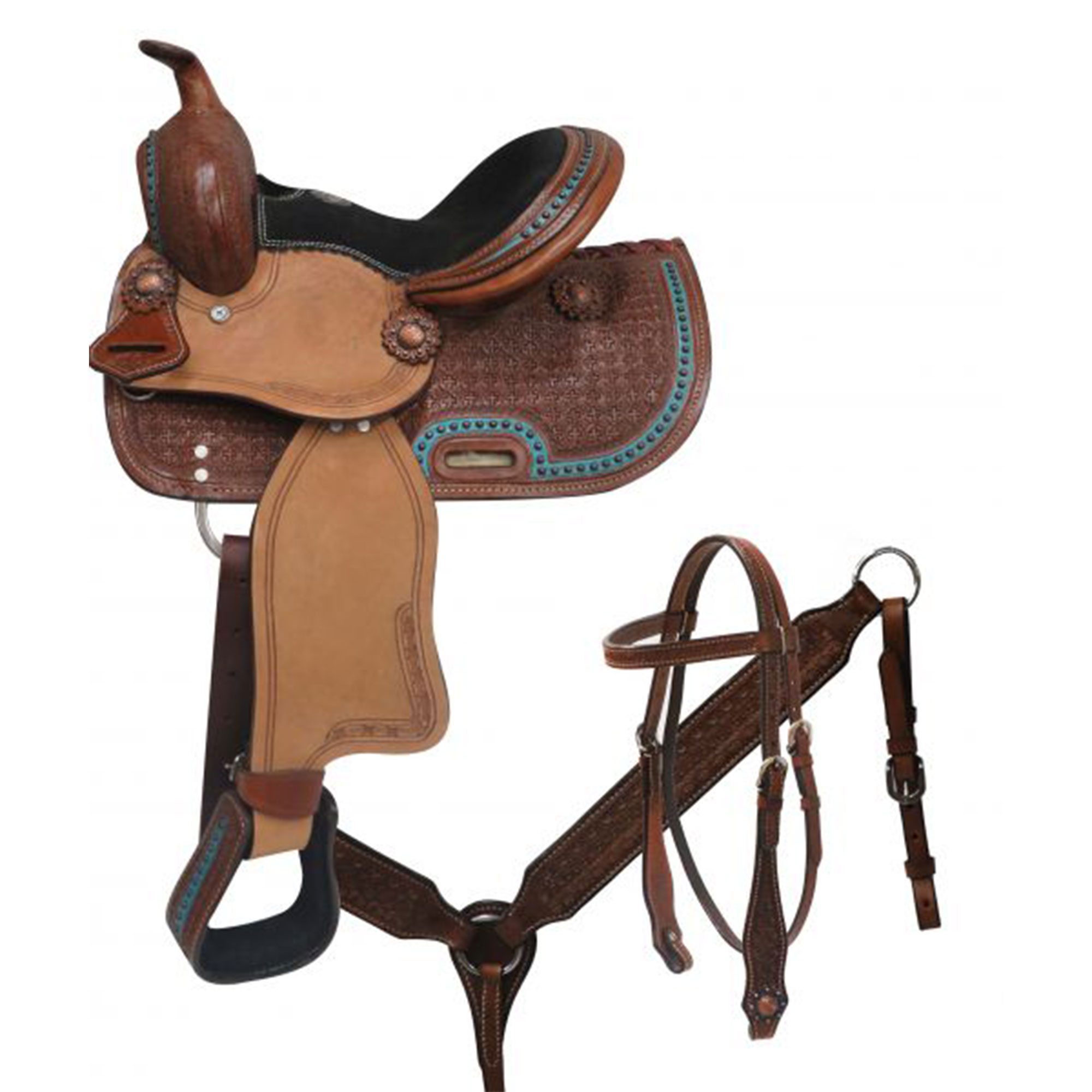 Introduce young riders to style and functionality with the Double T® Pony Pioneer Saddle Set. Crafted from medium-oiled leather, this 10-inch saddle features intricate basket tooling on the pommel, cantle, skirts, and stirrups, accented with teal and stud details for a vibrant, eye-catching look. Copper berry conchos add classic western charm, while the black suede seat ensures comfort for your young rider.
