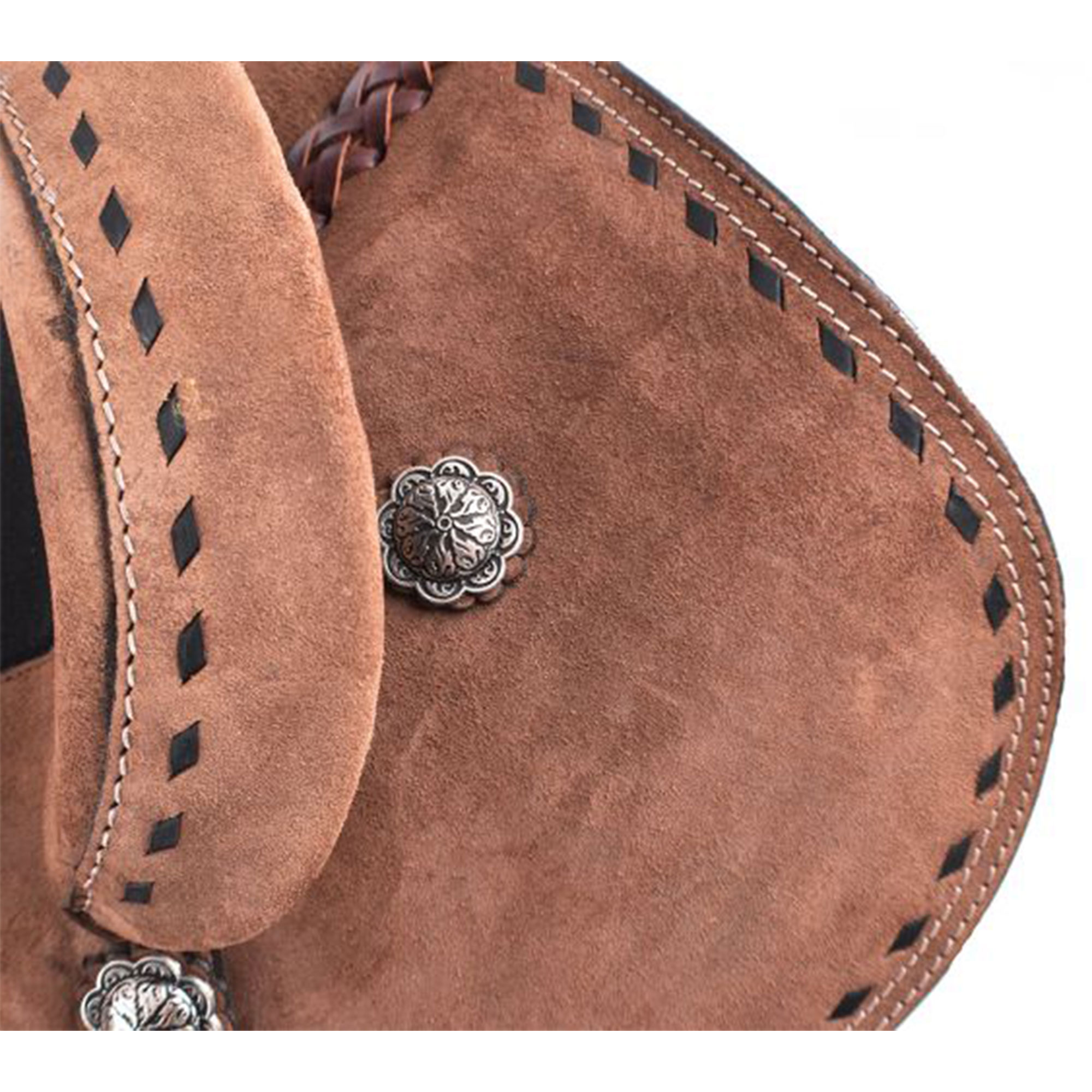 Crafted with a complete chocolate brown roughout leather, this saddle offers a secure and non-slip surface, ideal for barrel racing and other fast-paced disciplines. The saddle is beautifully accented with dark brown buckstitch trim, adding a touch of sophistication to its rugged design.
