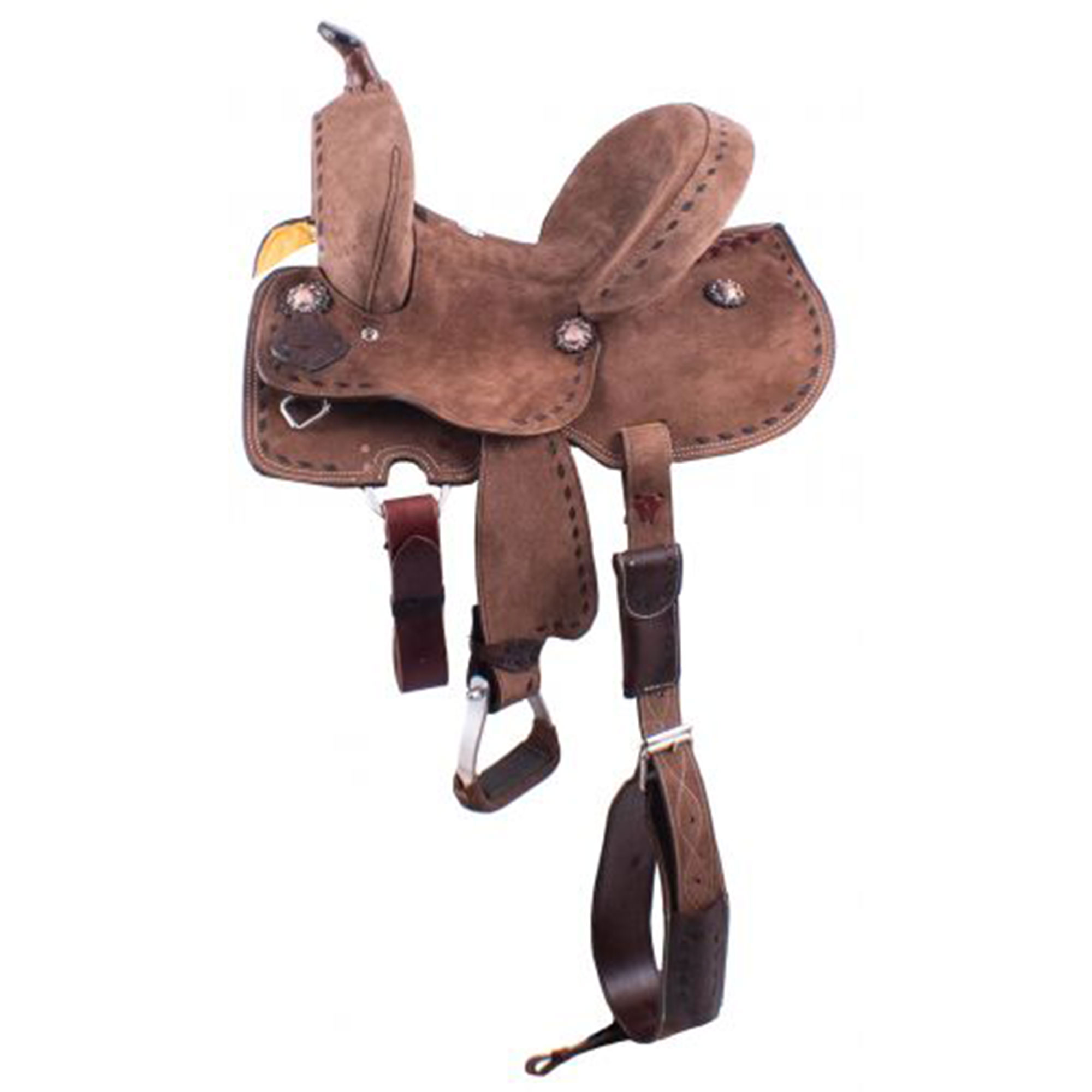 Copper-colored conchos and aluminum stirrups with rubber grip tread complete the look with practical elegance. This youth barrel saddle also includes a leather tie strap, off billet, and back rigging with a handy knife pocket—making it a reliable and stylish choice for everyday riding or the arena.