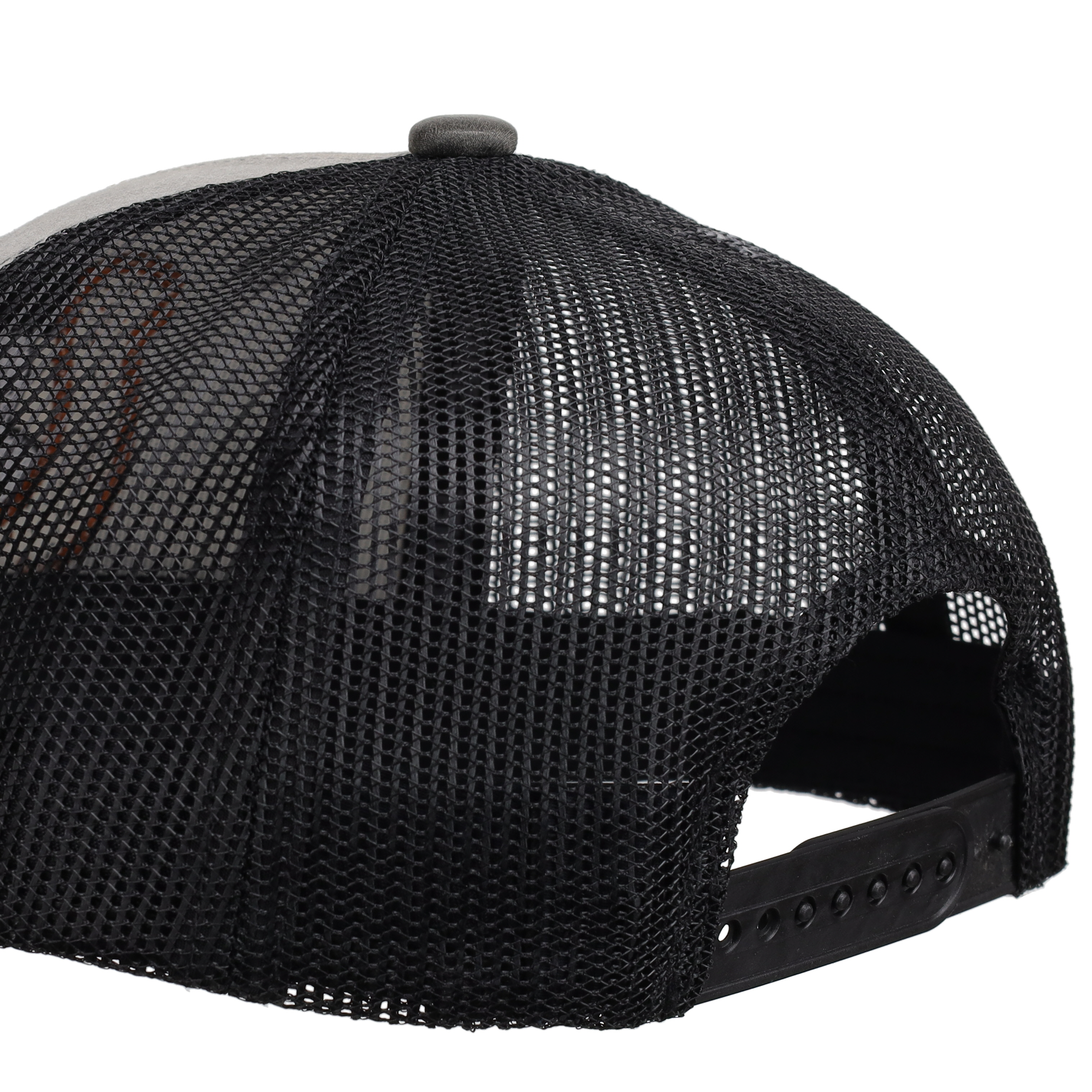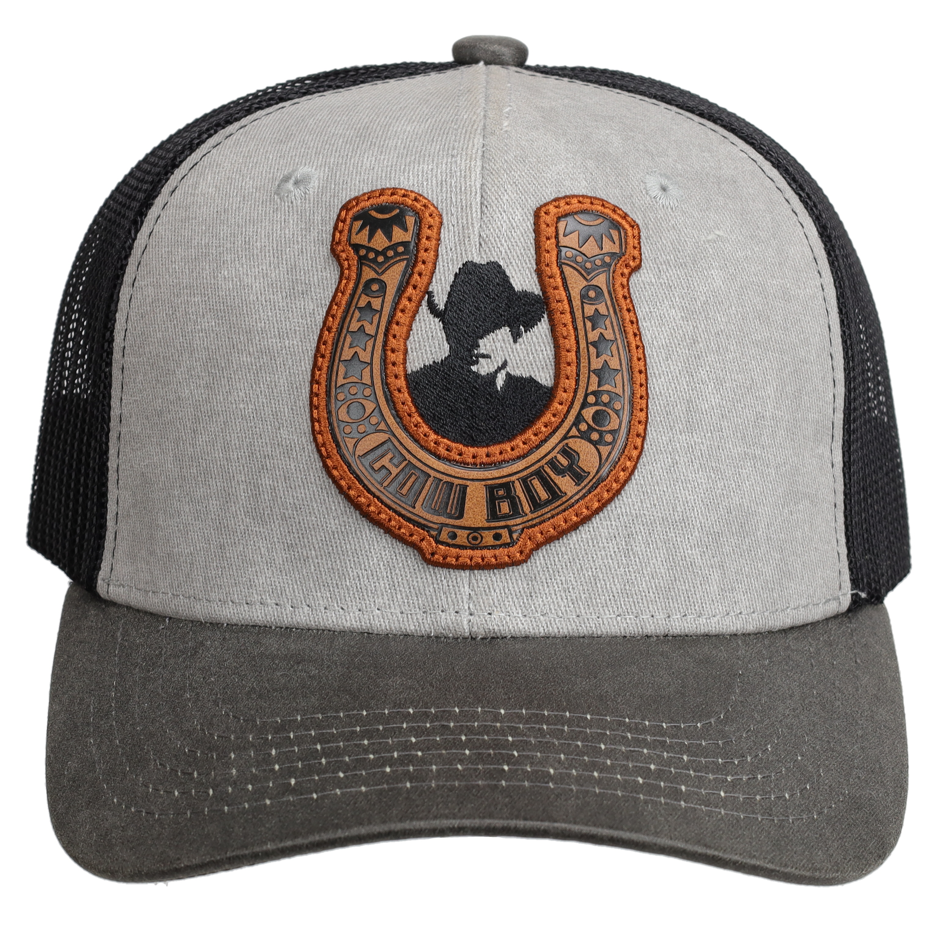This cap features a light gray front panel, charcoal gray bill, and a black mesh back panel for breathability and comfort. The front showcases a brown leather horseshoe patch with the word “Cowboy” and a black embroidered cowboy silhouette, adding a bold and rustic touch.