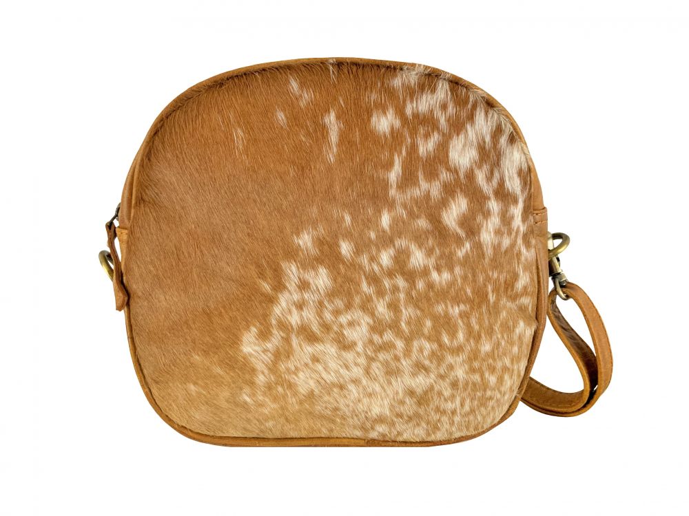 Klassy Cowgirl Brown & White Leather Crossbody Bag with hair on cowhide. This handbag features a brown and white hair on cowhide, adjustable/removable strap and zipper pockets on the inside and outside. Measures Approx. 10" H x 11" W.