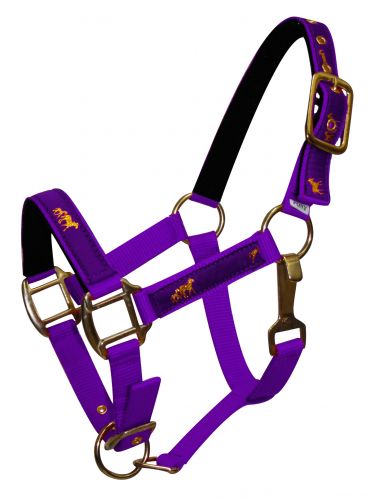 Pony size nylon halter with "running horse" overlay. Halter has neoprene lined nose and crown. Comes with eyelets on crown. Has adjustable nose and throat latch.