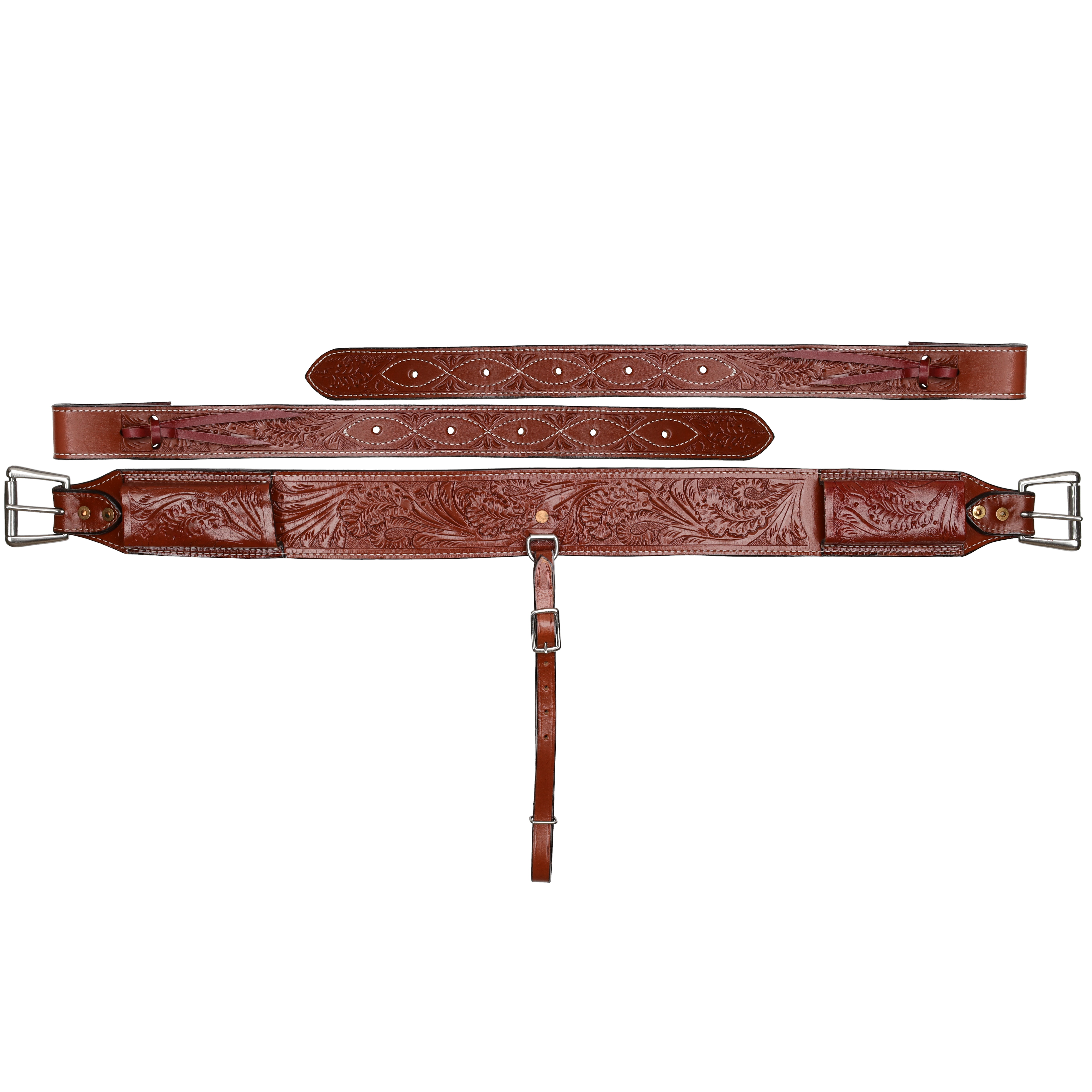 Showman ® 3" wide Acorn Tooled Leather back cinch with roller buckles. This back cinch comes fully equipped with 3/4" billet straps and girth connector. Roller buckles make this cinch easy to adjust.