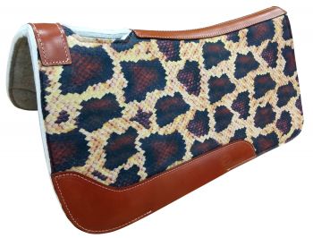 Showman ® 31" X 32" Python Print Solid Felt Saddle Pad. This pad features gray felt bottom, python print top with over sized medium brown wear leathers and a medium brown leather reinforced spine. Pad measures 1" thick.