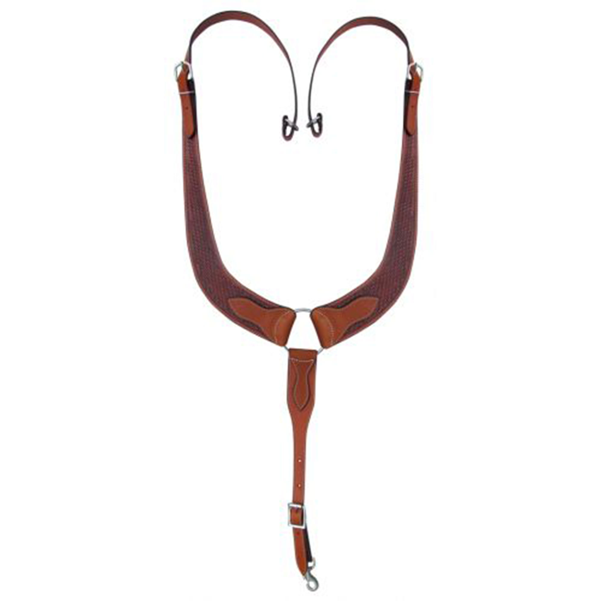 Showman ® Basketweave tooled pulling collar. Pulling breast collars allow the horse more freedom of shoulder movement and better leverage when pulling. Great for working ranch horses and trail riders. Equipped with stainless steel hardware.