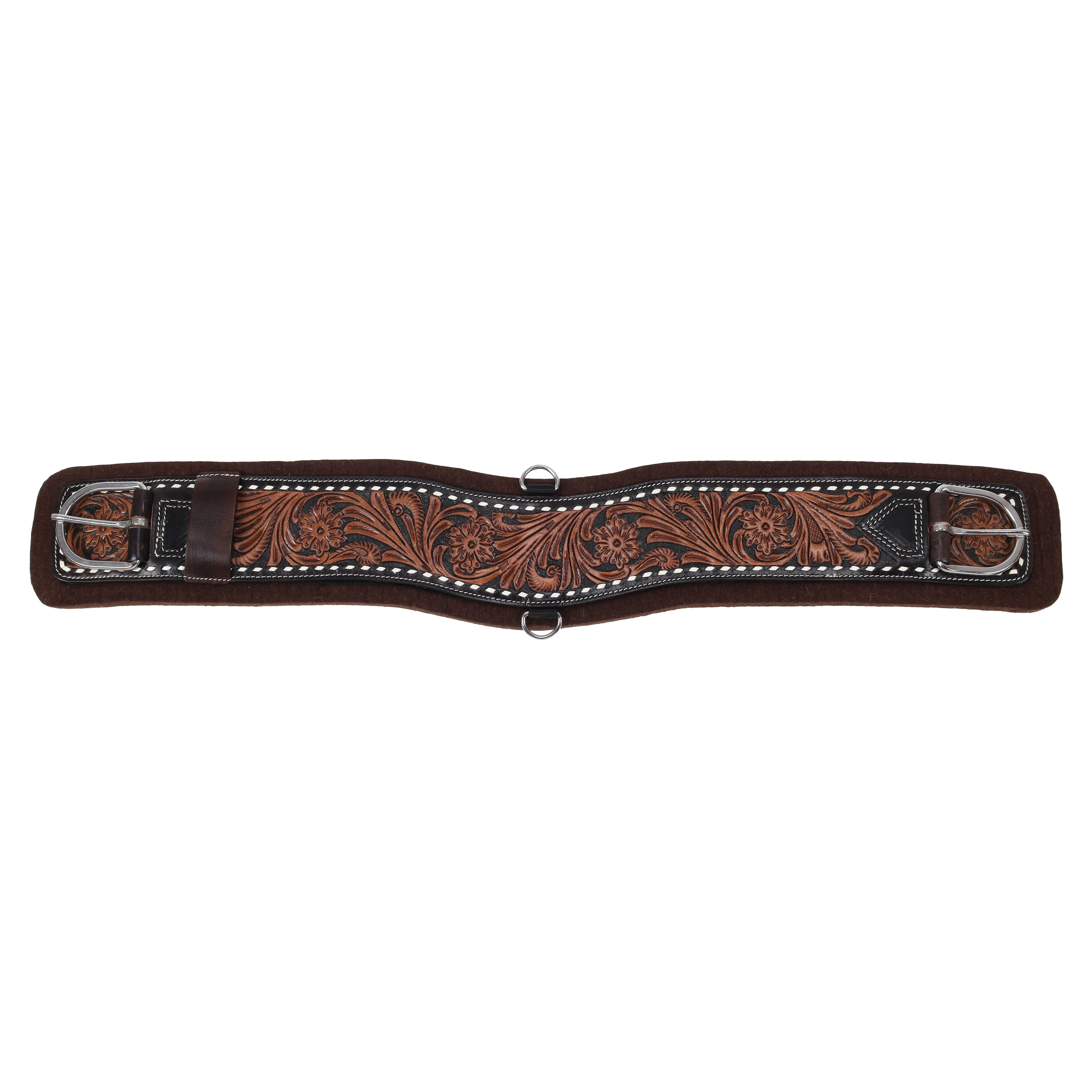 The brown felt bottom ensures optimal comfort for your horse, providing a soft and breathable surface that reduces pressure points while maintaining stability during rides. The contoured design is specifically shaped to fit the natural form of your horse, allowing for greater freedom of movement and minimizing chafing. Equipped with two D-rings for gear attachment, the girth allows for easy attachment of accessories such as breast collars, ensuring versatility for various equestrian activities. This girth is finished with a strap keeper for added convenience and tidiness.