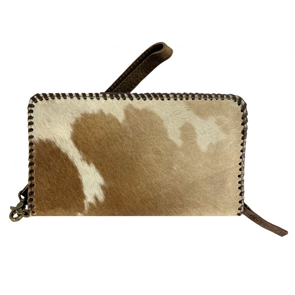 Showman ® Brown and white hair on Cowhide Clutch Wallet. Comes with a removable wrist strap and tassel zipper. Measures approx. 4.5"H x 8"W