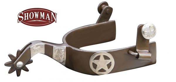 Showman ® Brown steel spur with 1" band and 2.25" shank. Details are Texas star concho and engraved silver bar accents.