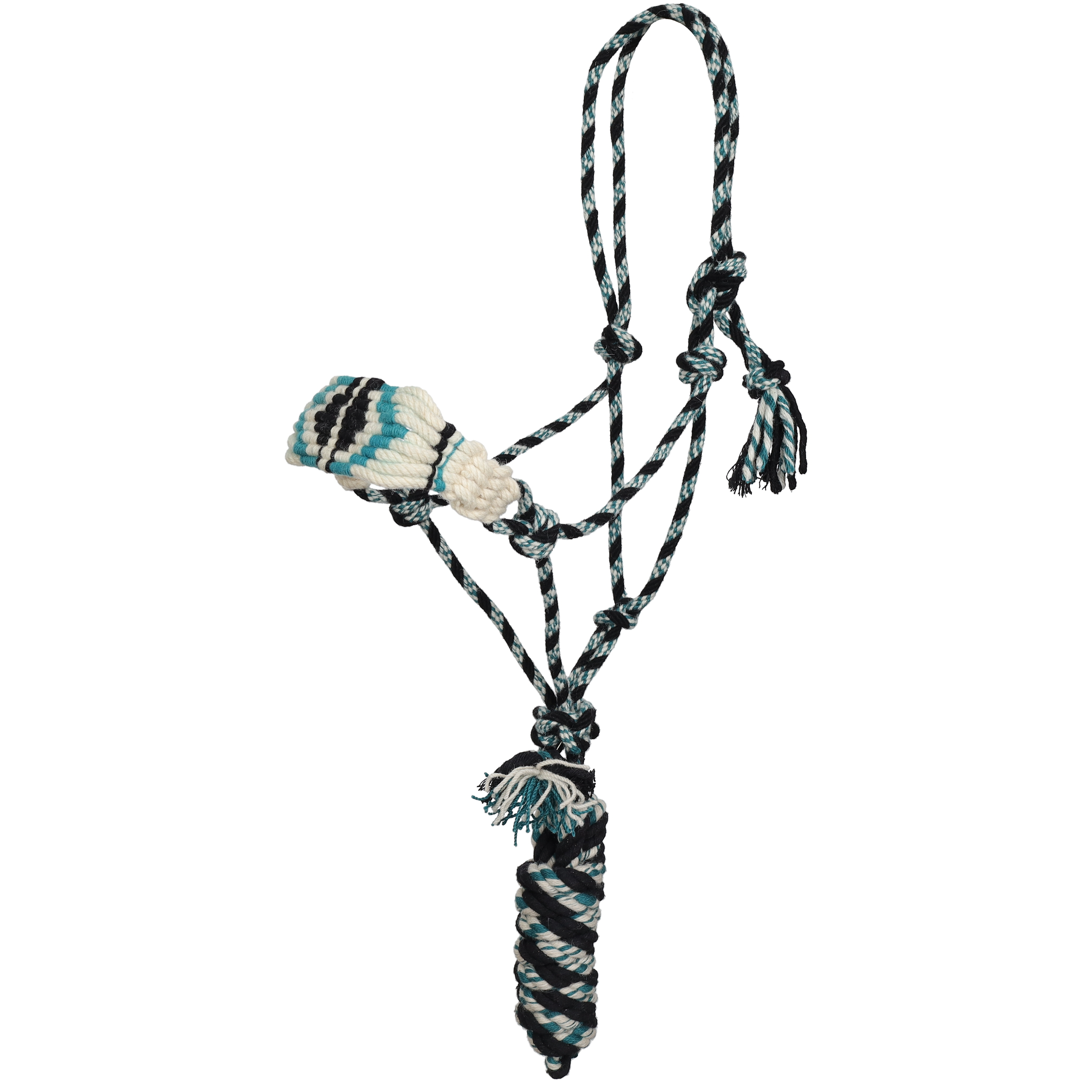 The classic cowboy knot construction delivers a secure, adjustable fit that naturally releases pressure during handling, promoting clear cues and reduced stress. The hand-woven noseband showcases a bold geometric pattern—featuring a central diamond or Aztec-inspired motif—in contrasting teal, black, and white/cream strands, adding rich texture, depth, and authentic southwestern coastal flair. Coordinating twisted rope details and fringe tassels enhance the movement and cohesive look, while the included matching mohair lead provides immediate convenience and unified style.