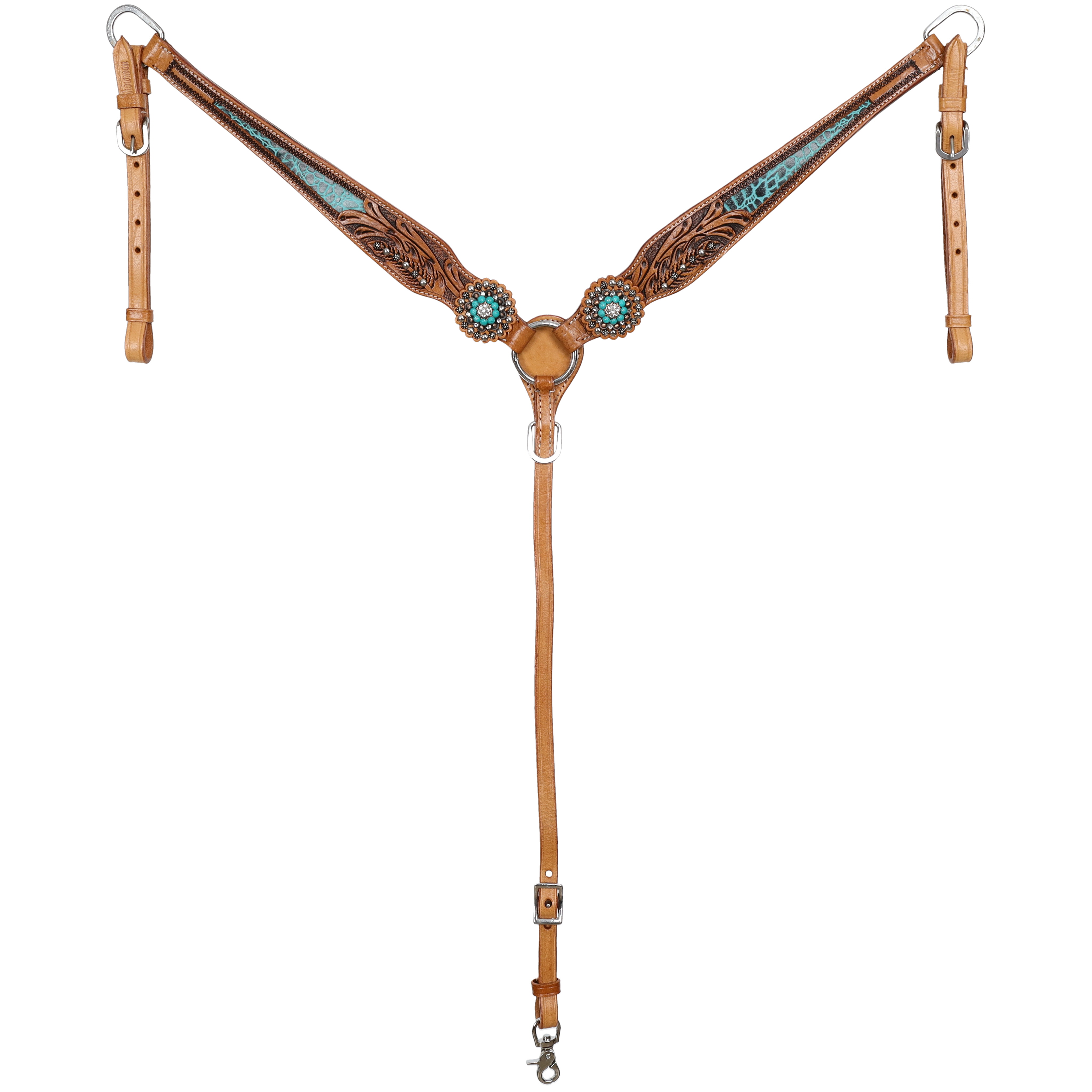 Bring a touch of exotic elegance to your tack room with the Showman® Everglade Set, a breathtaking combination of rich medium oiled leather and striking dark accents. The beautiful leaf tooled detailing adds classic Western artistry, while the vibrant teal gator inlays on the cheeks and breastcollar create a bold, eye-catching contrast that feels both luxurious and adventurous. Rhinestone concho accents sparkle with subtle brilliance, perfectly complemented by antique buckles featuring silver floral overlays and delicate silver stud accents throughout for a refined, head-turning finish.
