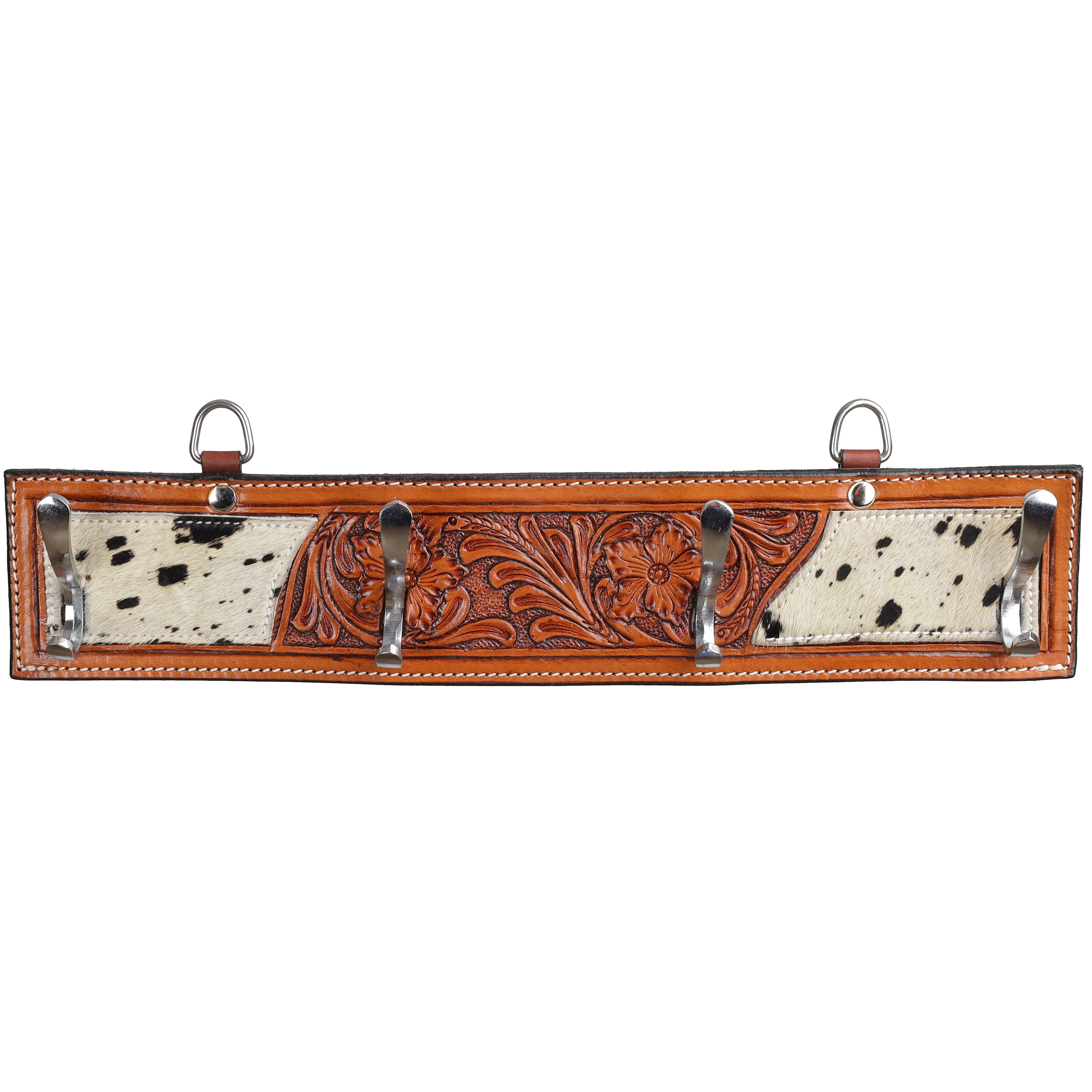 The tooled leather showcases an intricate floral and leaf pattern, framed by genuine cowhide panels on each end for a unique and eye-catching look. Designed with four dual curved silver hooks, this rack provides extra hanging capacity while adding a decorative touch to any space. Complete with two silver D-rings for secure wall mounting, this rack combines functionality with premium western design.