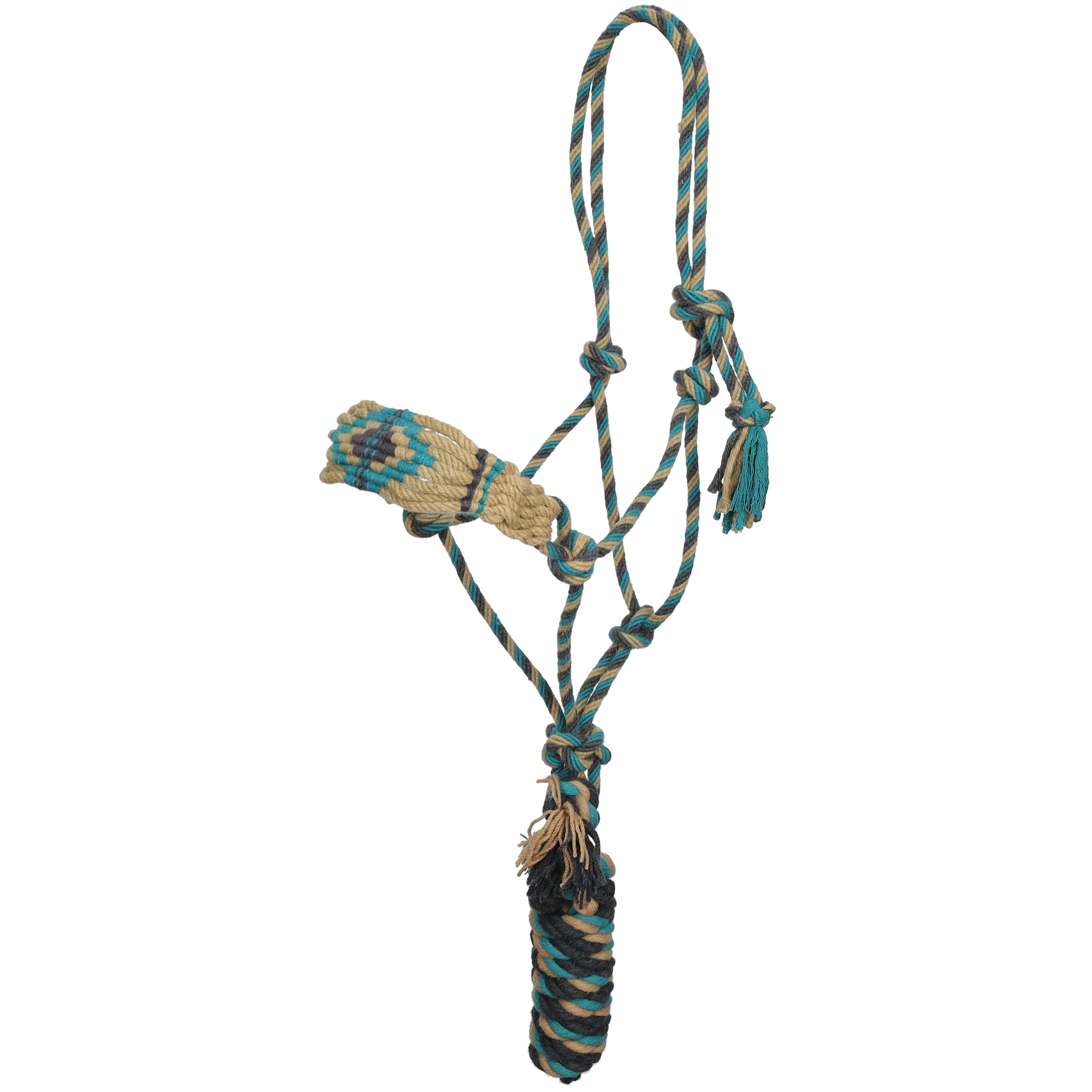 The Showman® Frosted Mesa Mohair Cowboy Knot Halter with Lead evokes the cool, misty beauty of high desert mesas at dawn, with a frosted, serene color palette of soft teal-blue, pale gray, warm beige/tan, and subtle cream accents. Handcrafted from premium soft mohair rope, this halter delivers gentle comfort for your horse's sensitive face alongside the durability required for daily handling, groundwork, or ranch tasks. The classic cowboy knot construction provides a secure, adjustable fit that naturally releases pressure during use, ensuring clear communication and reduced discomfort.