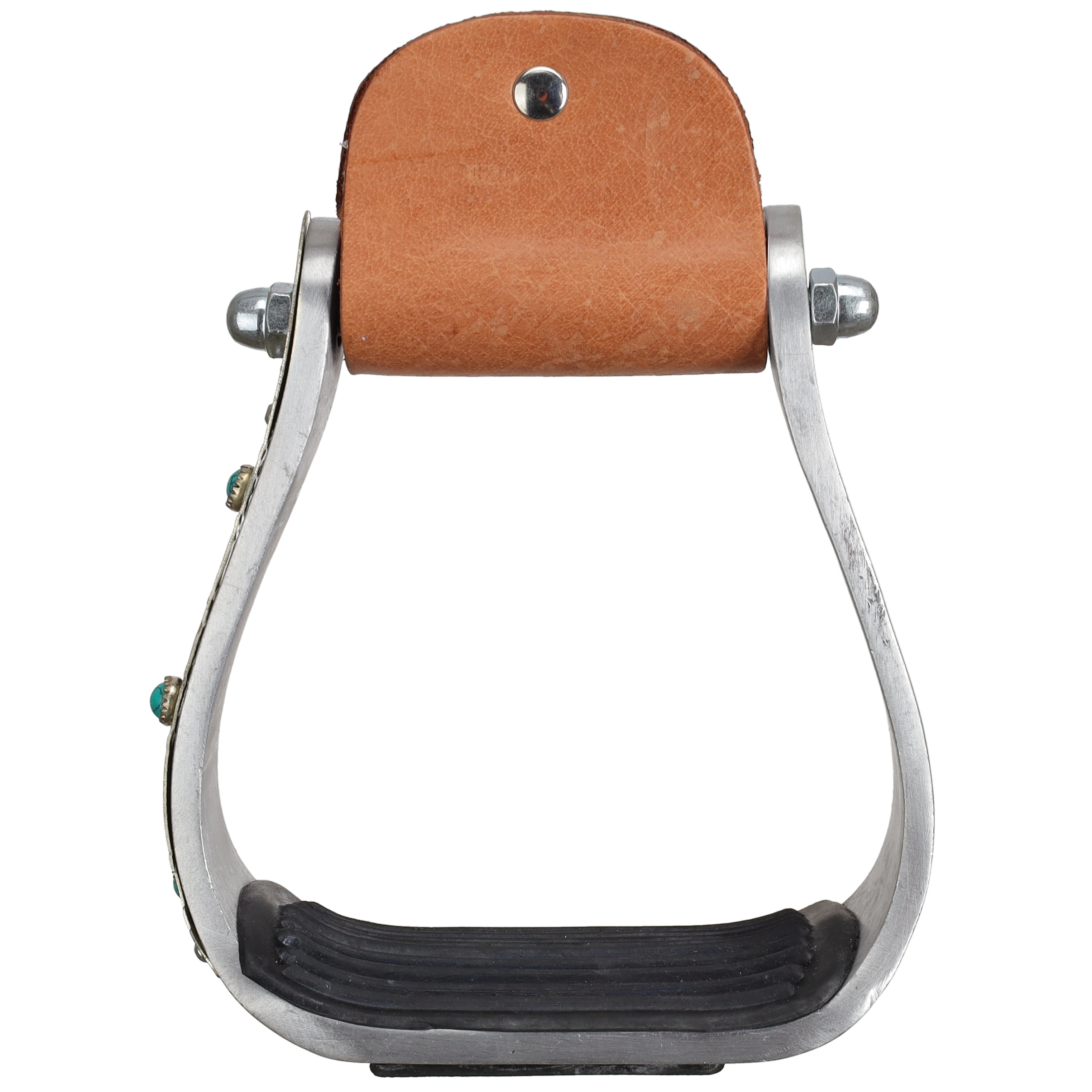 The Showman® Heartland Cowgirl Aluminum Stirrups blend western charm with dependable function, making them a standout choice for any rider. Crafted from lightweight aluminum, these stirrups feature a beautiful engraved silver overlay on the outer side, detailed with heart-shaped designs and accented with striking turquoise stones. This stylish combination brings a true cowgirl flair to your saddle, perfect for those who love riding with a touch of personality.