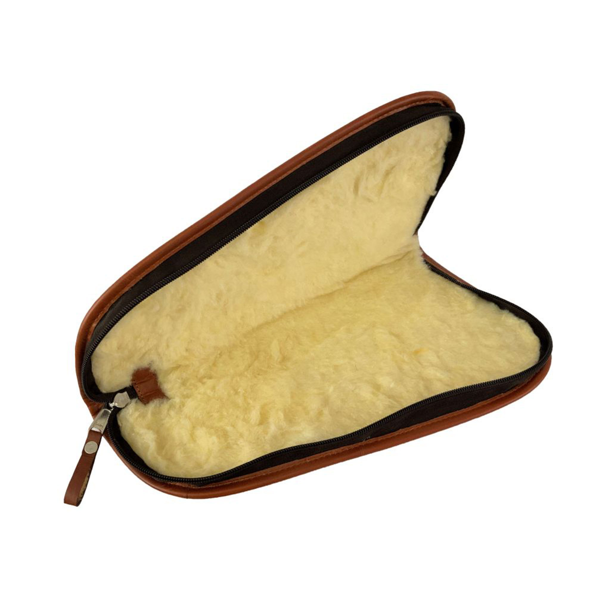 This soft handgun carry case is perfect for any cowgirl. This two-tone cowhide gun case is the perfect size to hold a variety of large handguns. The inside is lined with a soft fleece padding for protection. With a medium leather border and natural stitching, this pistol case features a leather zipper tab to ensure safe closure.
