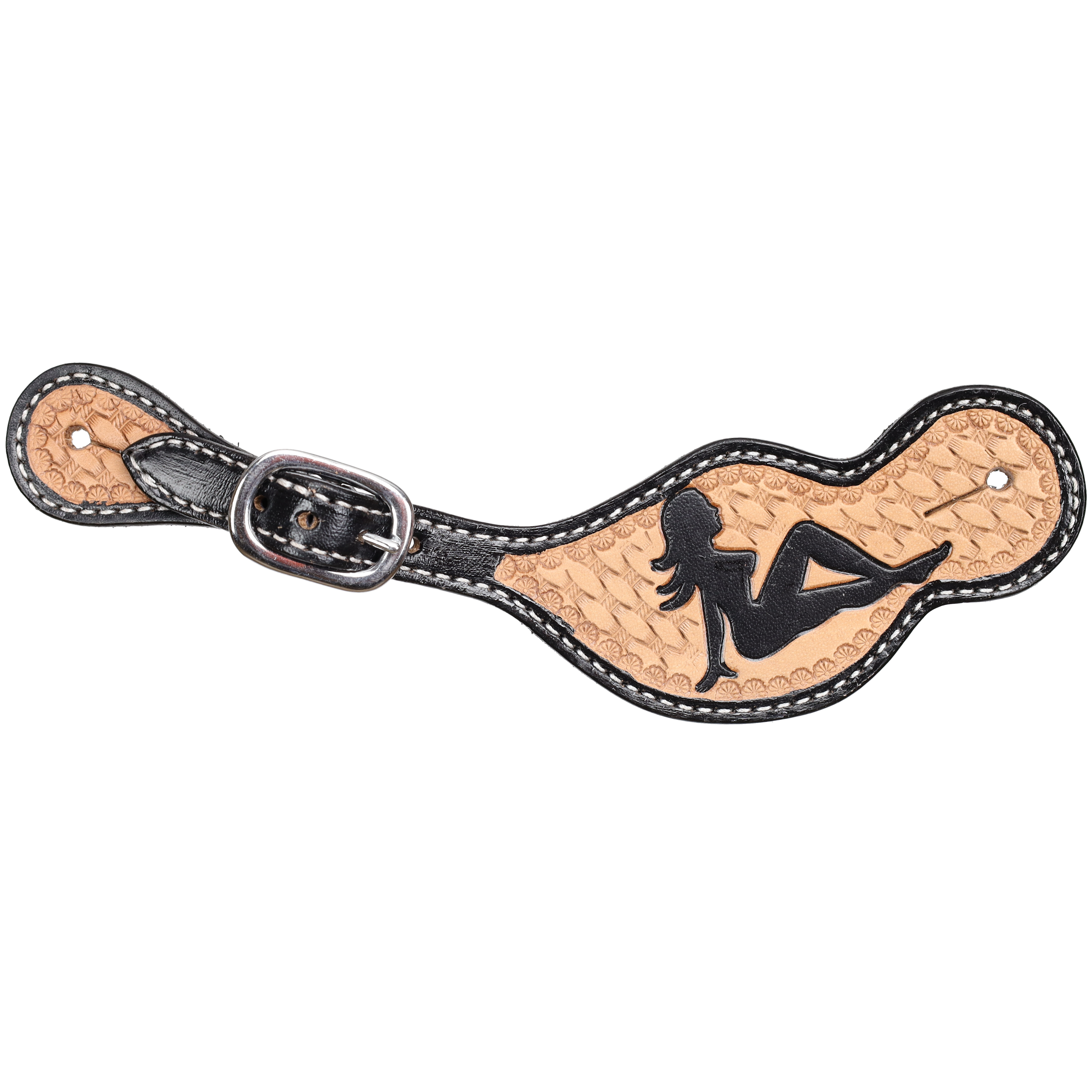 Add a little personality to your everyday ride with the Showman® Men's Trailside Cowgirl Spur Straps. Crafted from light oiled basketweave tooled leather, these spur straps offer a clean, classic western base with eye-catching detail. The black edges create sharp contrast, while the tooled trailside cowgirl design, painted in black, gives them a unique touch that stands out without being over the top.