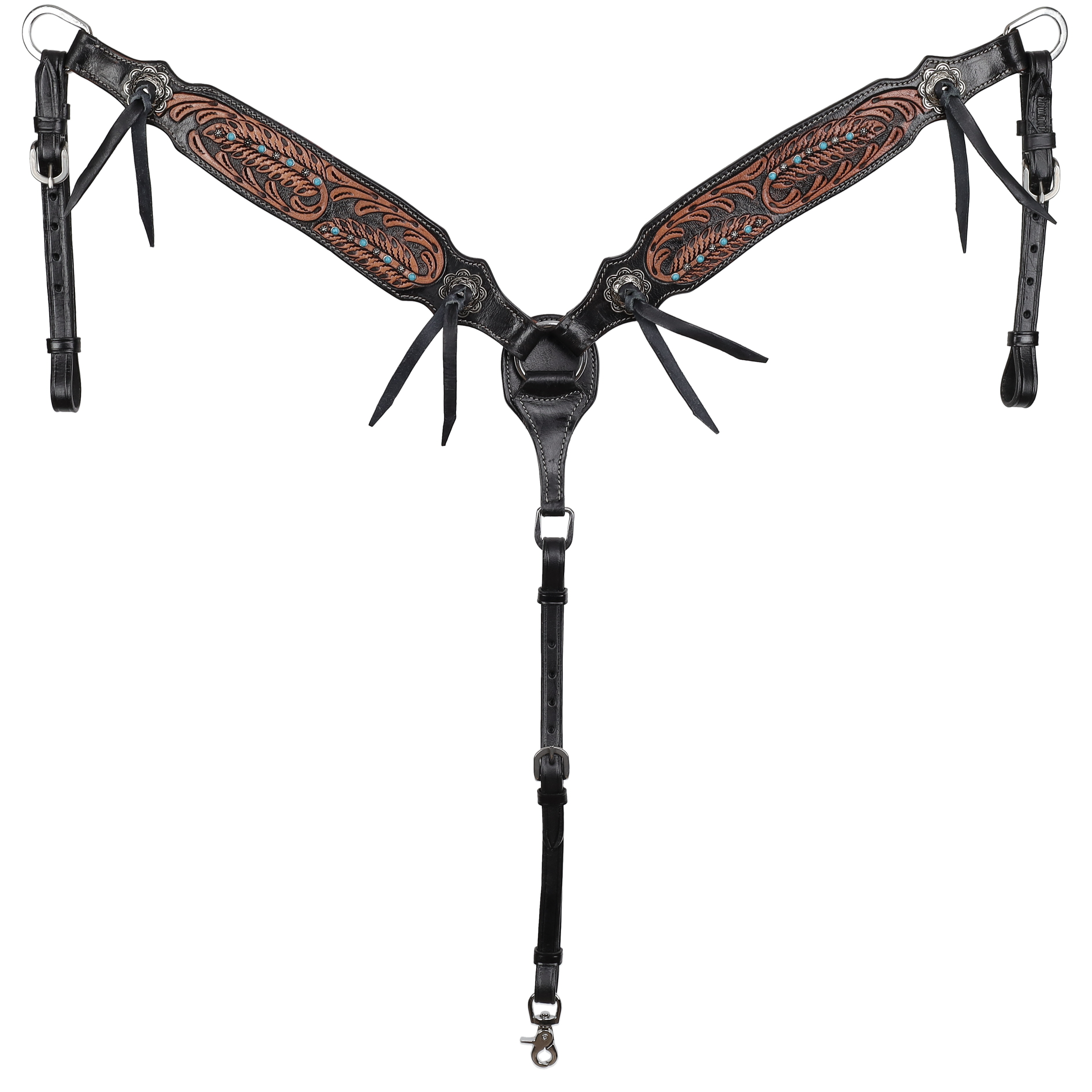 The Showman® Midnight Wing Browband Headstall and Breastcollar Set soars with dramatic western elegance, blending deep midnight-black leather, intricate feather tooling, and vibrant turquoise accents for a striking, high-contrast look that's perfect for show arenas, pleasure riding, or making a bold statement on the trail. Crafted from premium full-grain leather in a rich dark base, this coordinated set features a full browband headstall and matching breastcollar, both adorned with deep hand-tooled feather motifs that evoke the graceful sweep of midnight wings in flight. The tooling showcases flowing, detailed feathers in warm brown tones that pop against the dark leather, bordered by crisp white stitching for sharp definition and added durability.