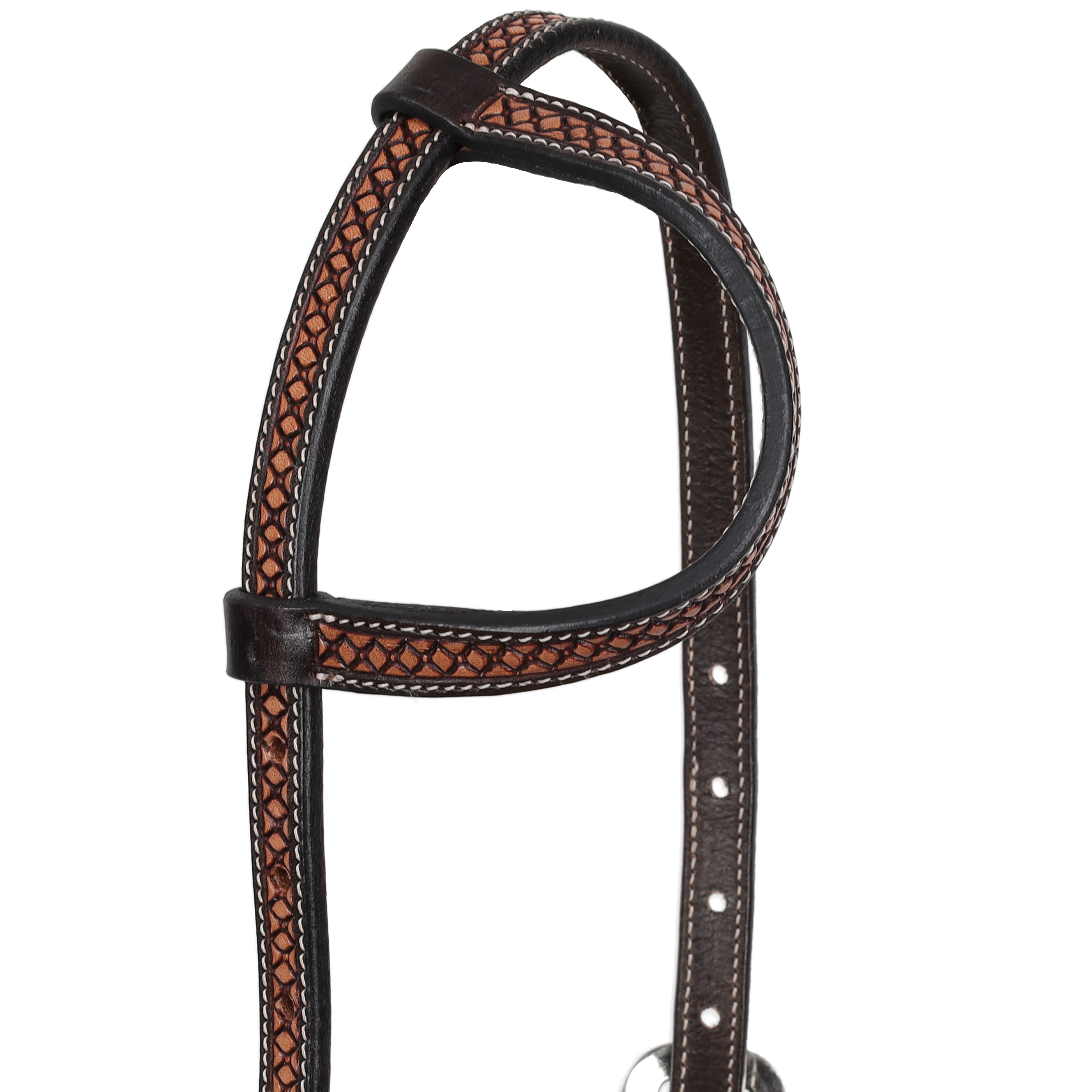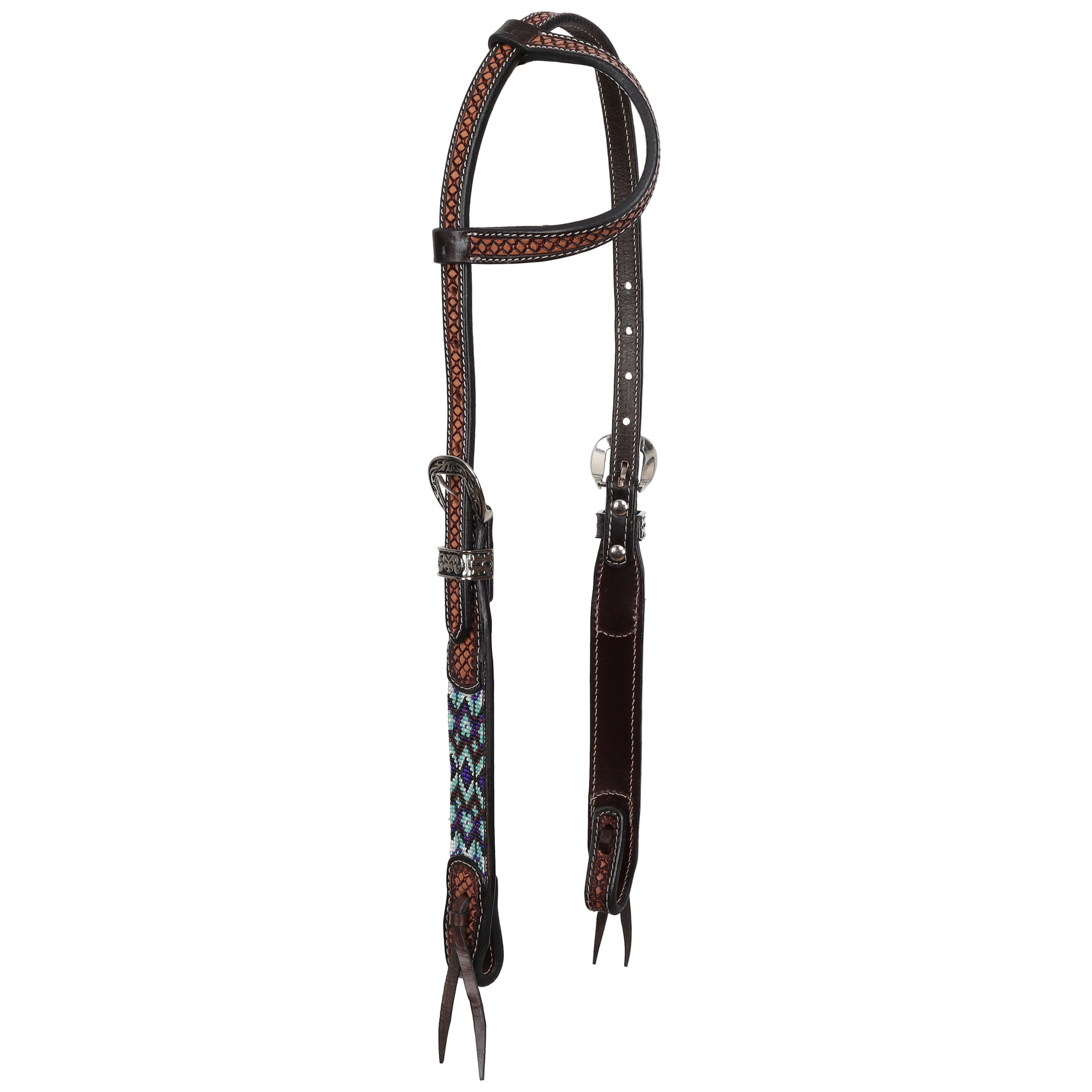 Designed for both comfort and convenience, this one ear headstall includes dual engraved buckle cheeks for easy adjustment and a secure fit. Finished with a leather tie bit connection, it offers dependable performance while delivering standout Southwestern flair in the arena or on the trail.