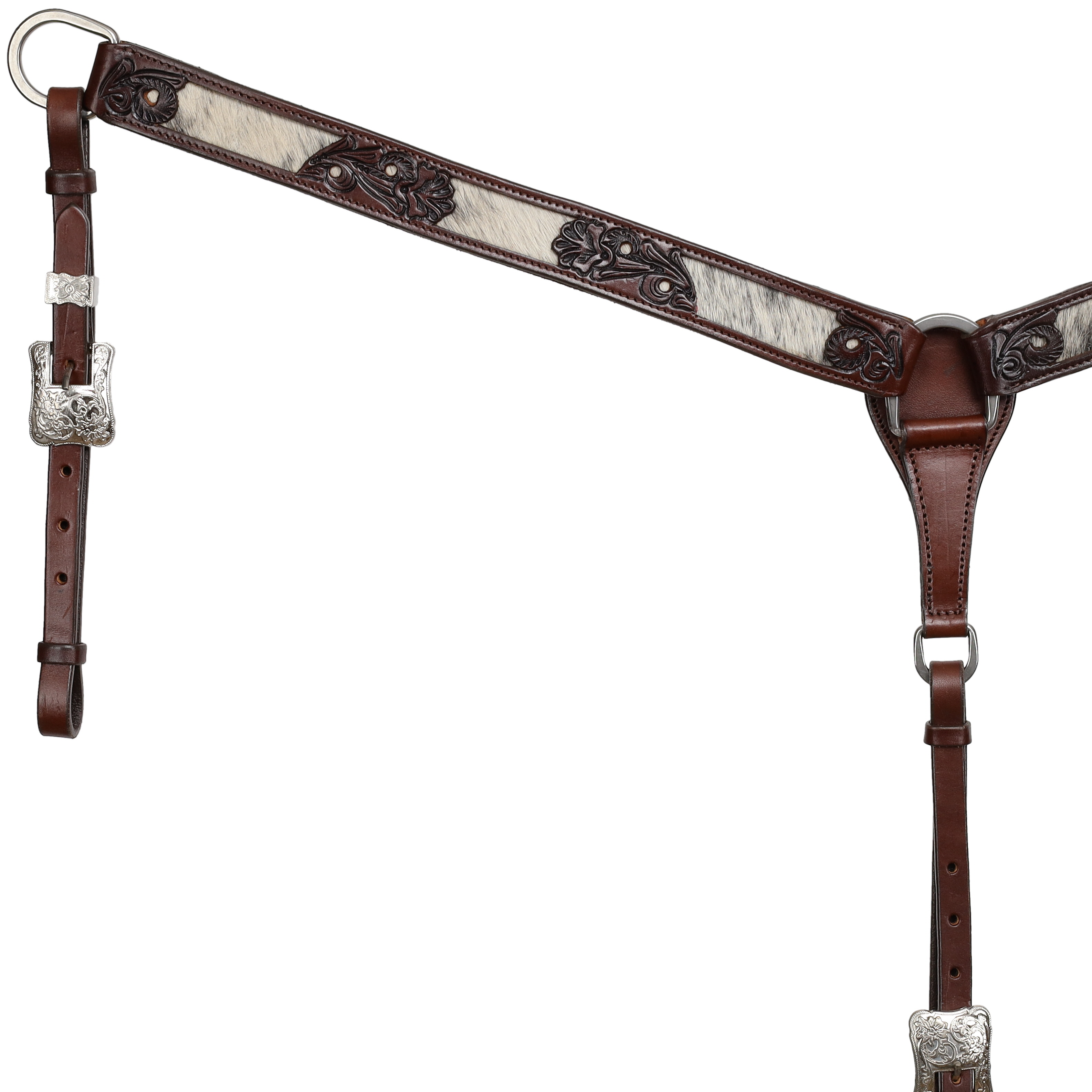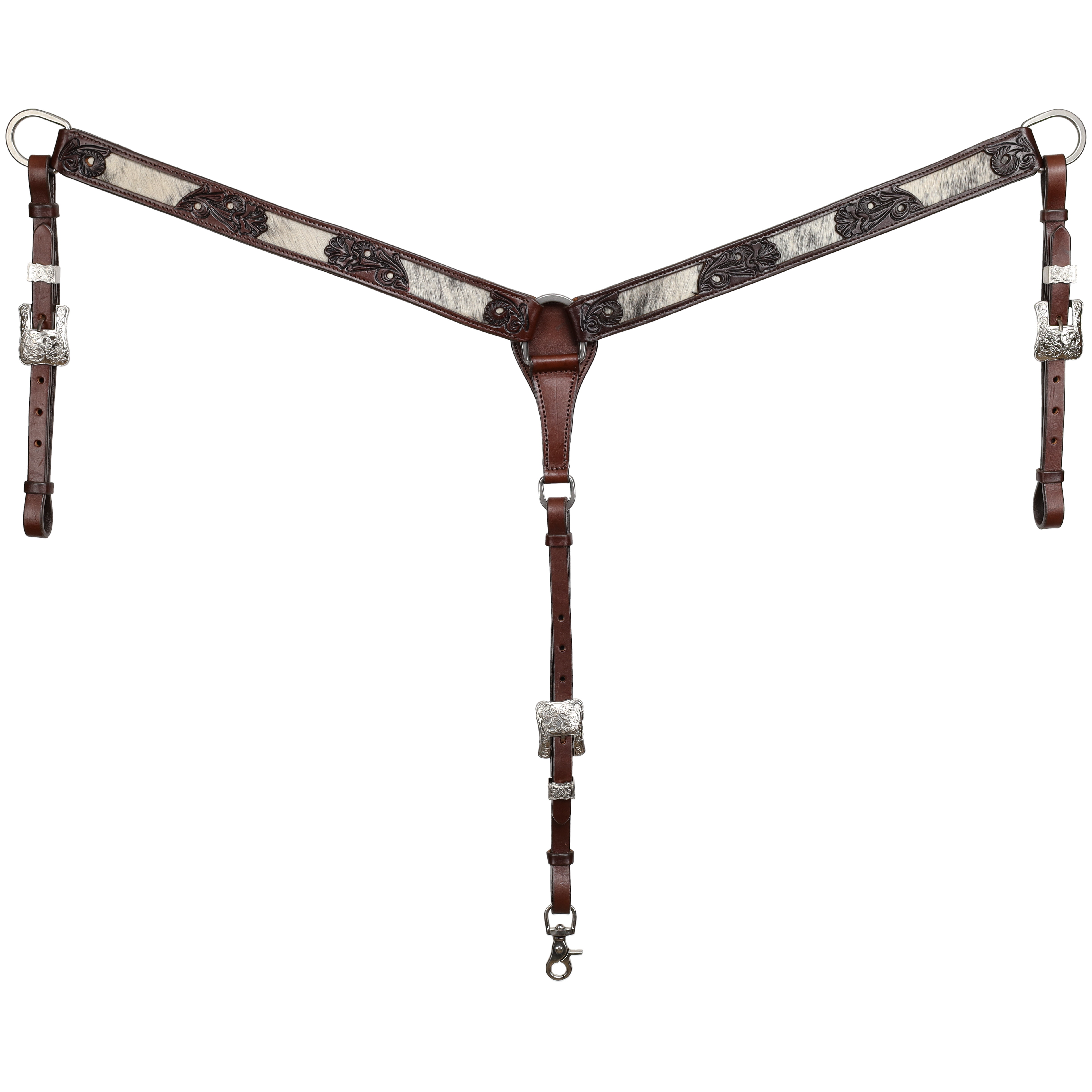 Add depth and classic western character to your tack with the Showman® Nightshade Hide Breastcollar. Crafted from dark oiled Argentina cow leather, this piece offers rich color and durable construction that stands up to everyday riding. The hand-tooled floral and leaf design is beautifully detailed and complemented by eye-catching cowhide inlays for added texture and contrast.