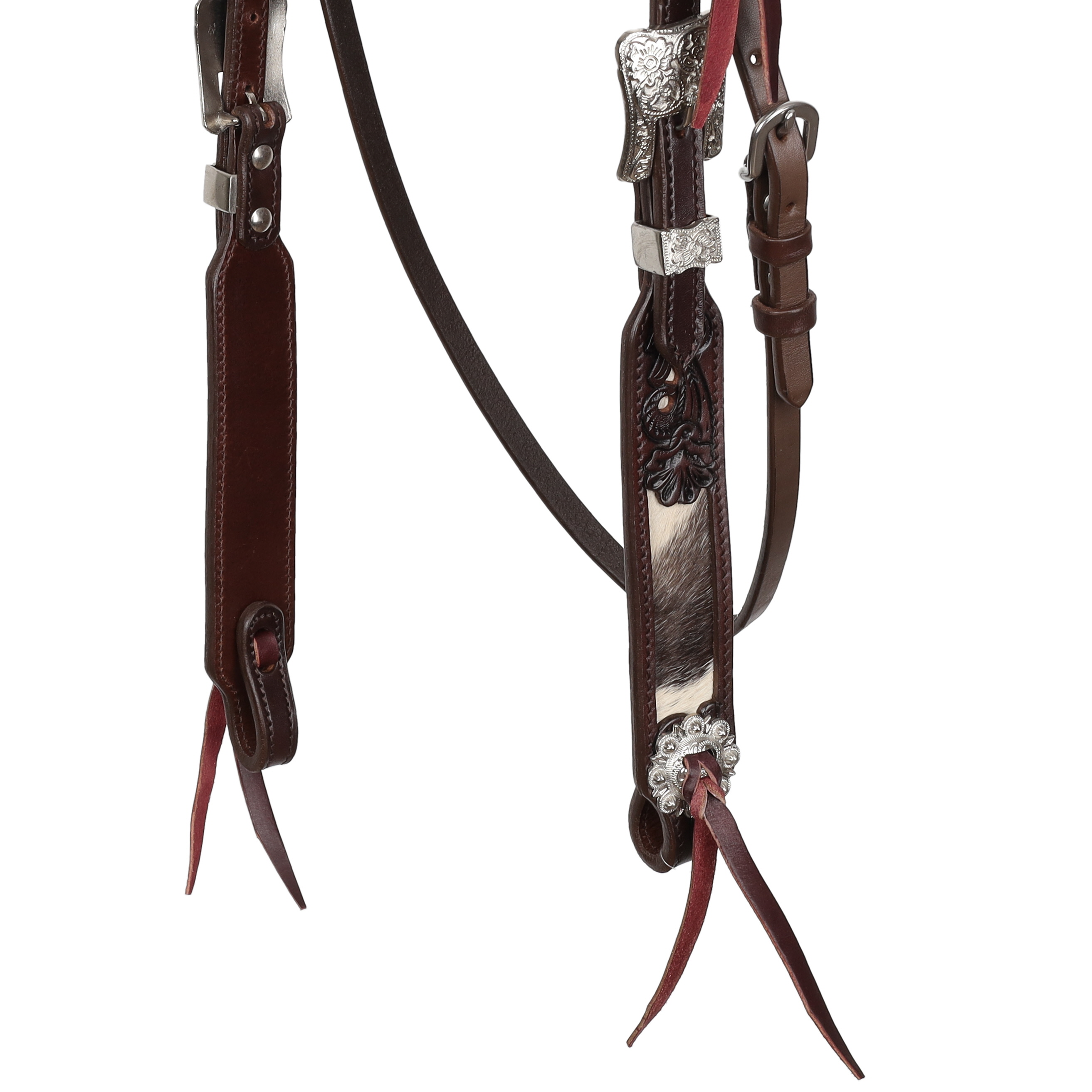 Rich textures and classic Western artistry come together in the Showman® Nightshade Hide Headstall. Crafted from soft, durable, and supple dark oiled Argentina cow leather, this headstall features beautifully hand-tooled floral and leaf designs paired with striking cowhide inlays on the browband and cheeks for a bold, rustic look.