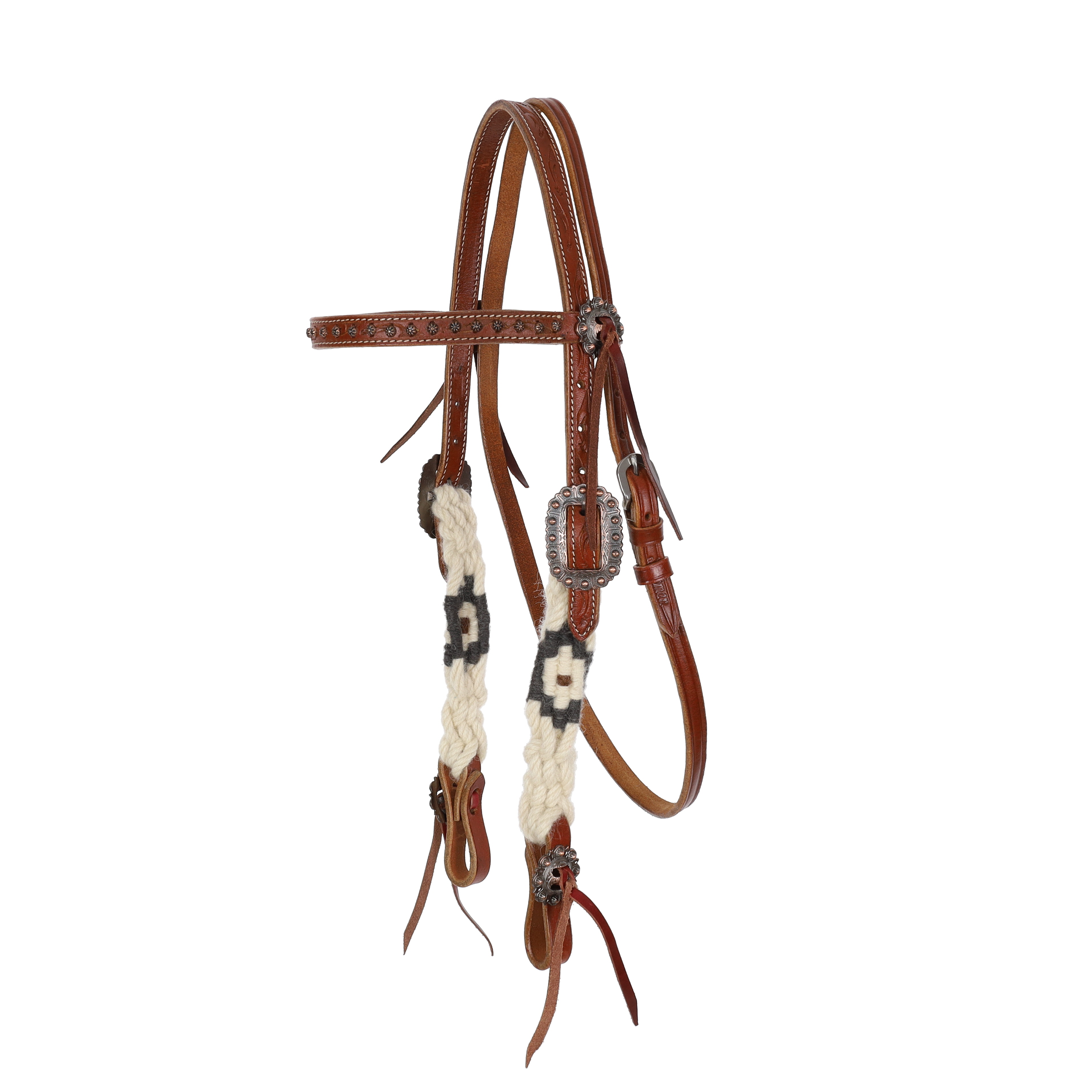Bring bold style to your tack collection with the Showman® Pinto Mohair Set! This standout set combines creamy white, gray, and brown mohair cord, creating a striking pinto-inspired pattern that’s sure to catch eyes in the arena or on the trail. The natural tones and rich texture of the mohair make for an earthy, timeless look, while the medium-oiled leather adds depth and durability to the set. Whether you’re competing or out for a pleasure ride, this headstall and breastcollar set will make your horse look stunning.