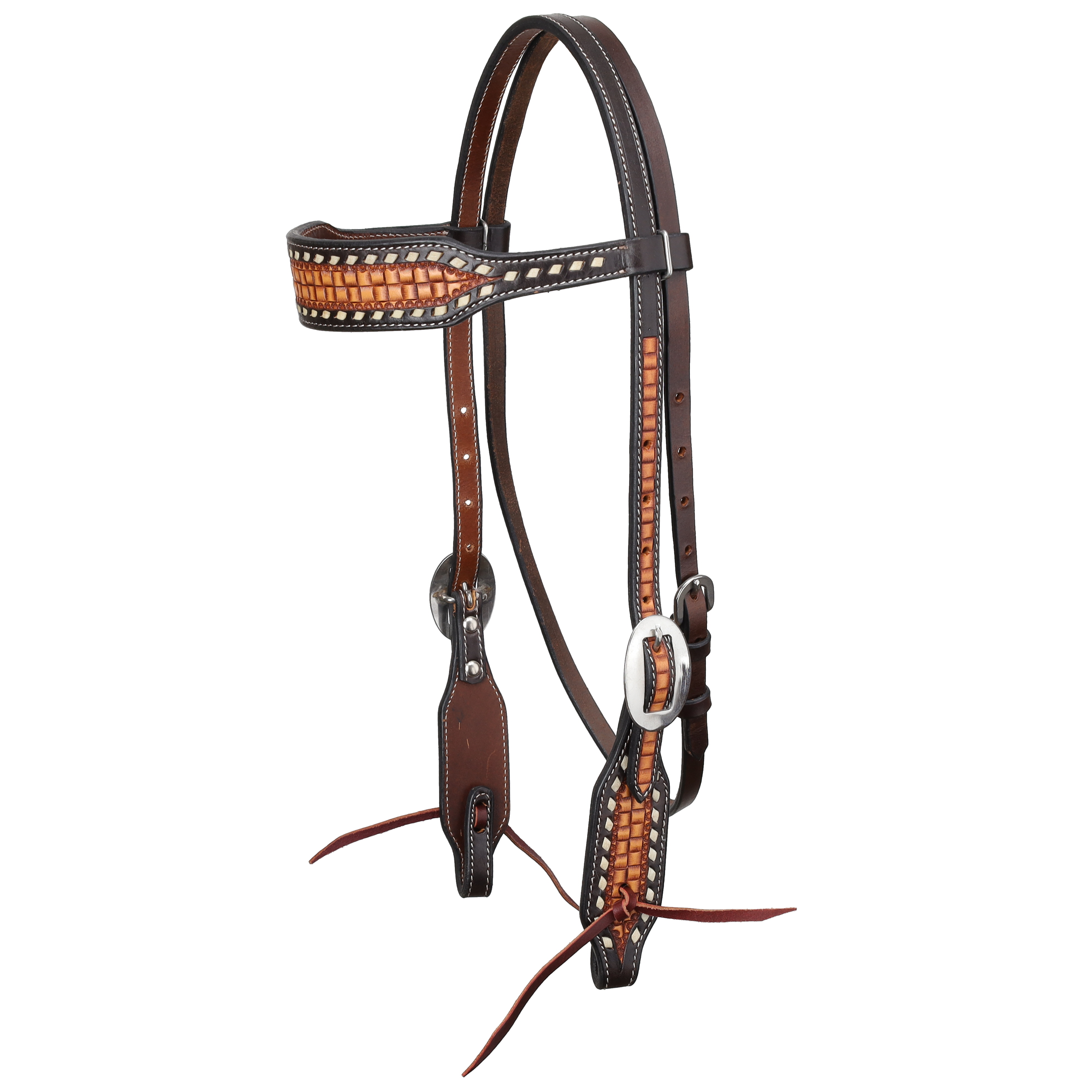 The Showman® Plains Patch Argentina Cow Leather Browband Headstall combines rugged durability with traditional western style. Crafted from chocolate oiled leather, it features medium oiled square basket tooling for a distinctive, handcrafted look. White buckstitch accents add contrast and flair, giving this headstall a classic yet eye-catching finish.