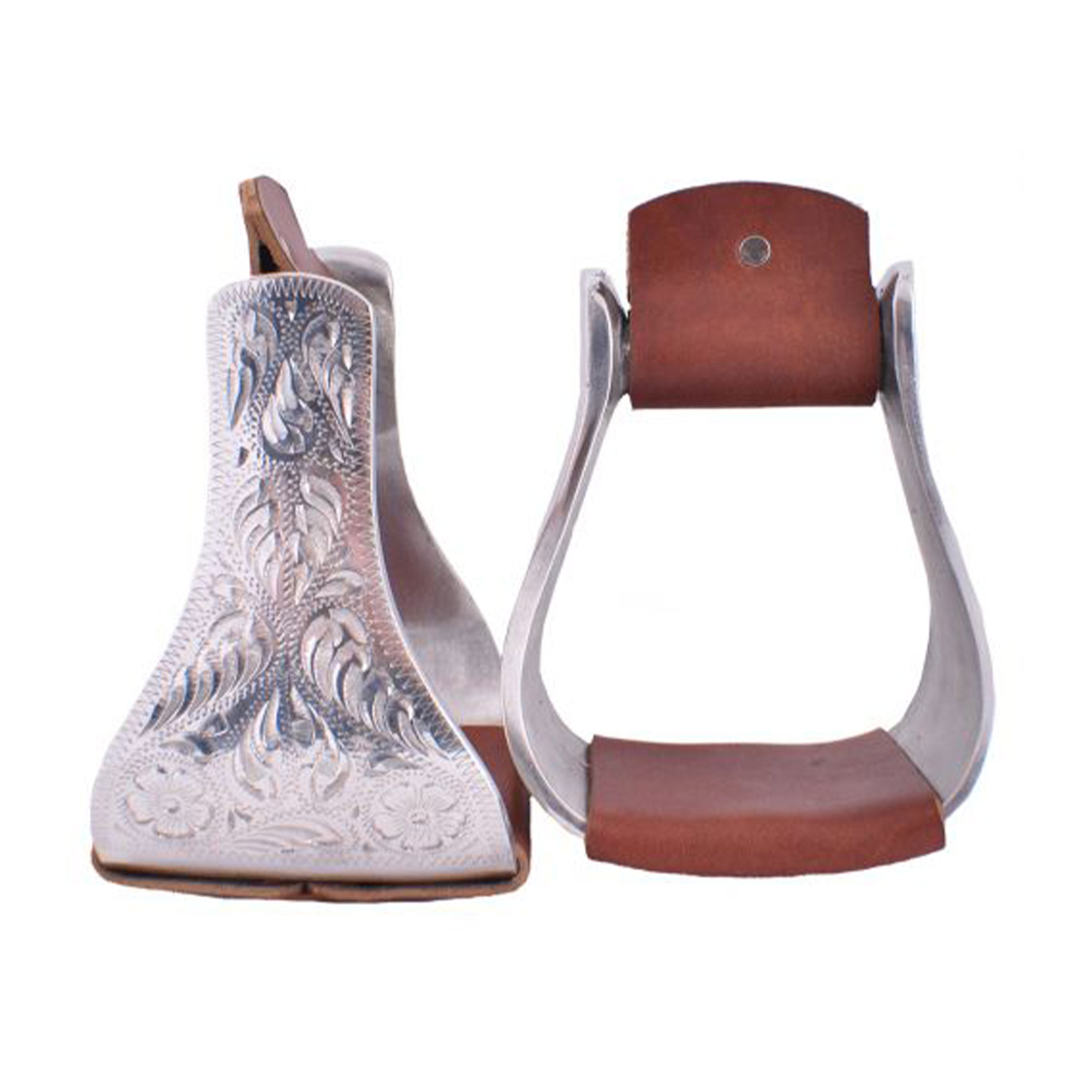 The Showman® Polished Aluminum Engraved Bell Stirrups combine timeless western elegance with functional design. Crafted from polished aluminum with stunning silver engraving, these stirrups add a refined touch to any saddle while maintaining durability for regular riding. The medium oiled leather tread not only enhances the classic look but also provides additional grip and comfort.