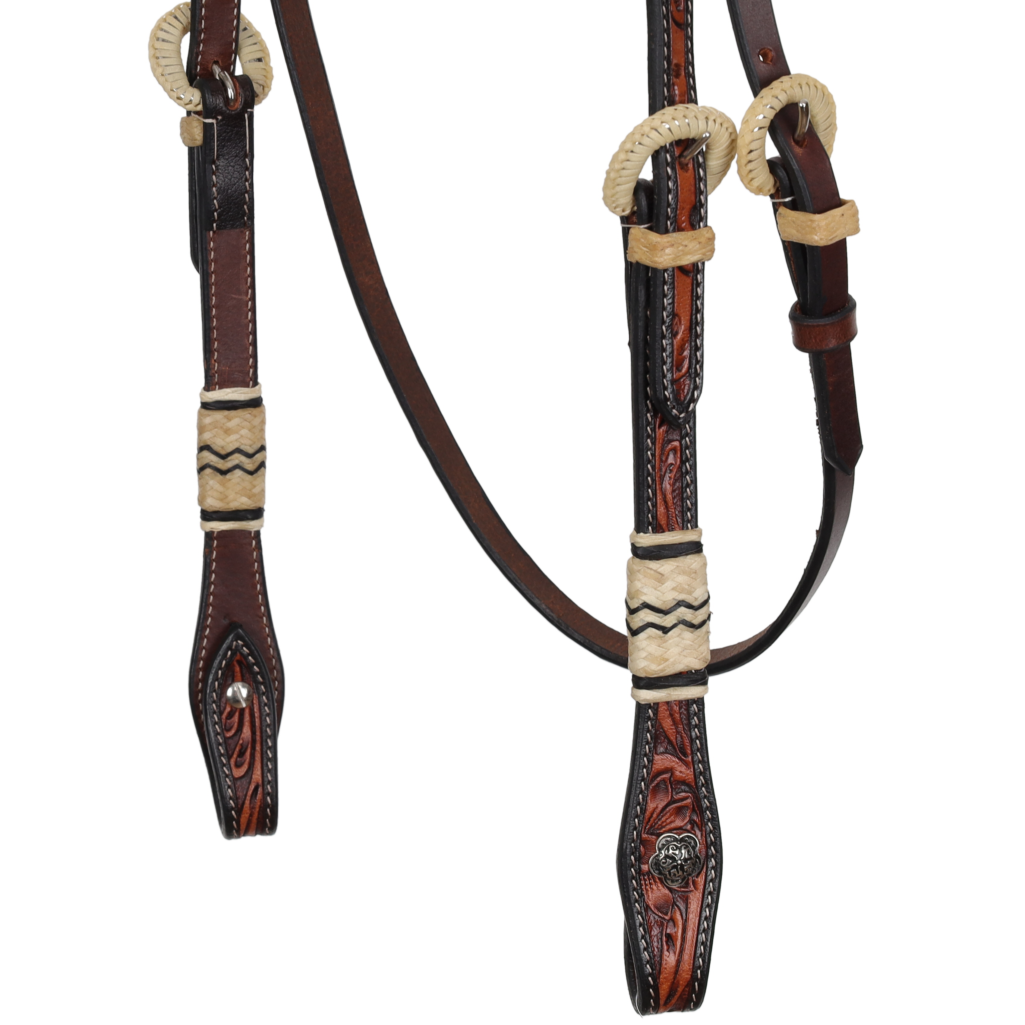 Bring timeless Western style and durability to your tack with the Showman® Prairie Oak Headstall. Crafted from dark oiled Argentina cow leather, this headstall features medium-oiled leaf tooling and striking rawhide accents on the cheeks and browband, creating a classic and refined Western look.