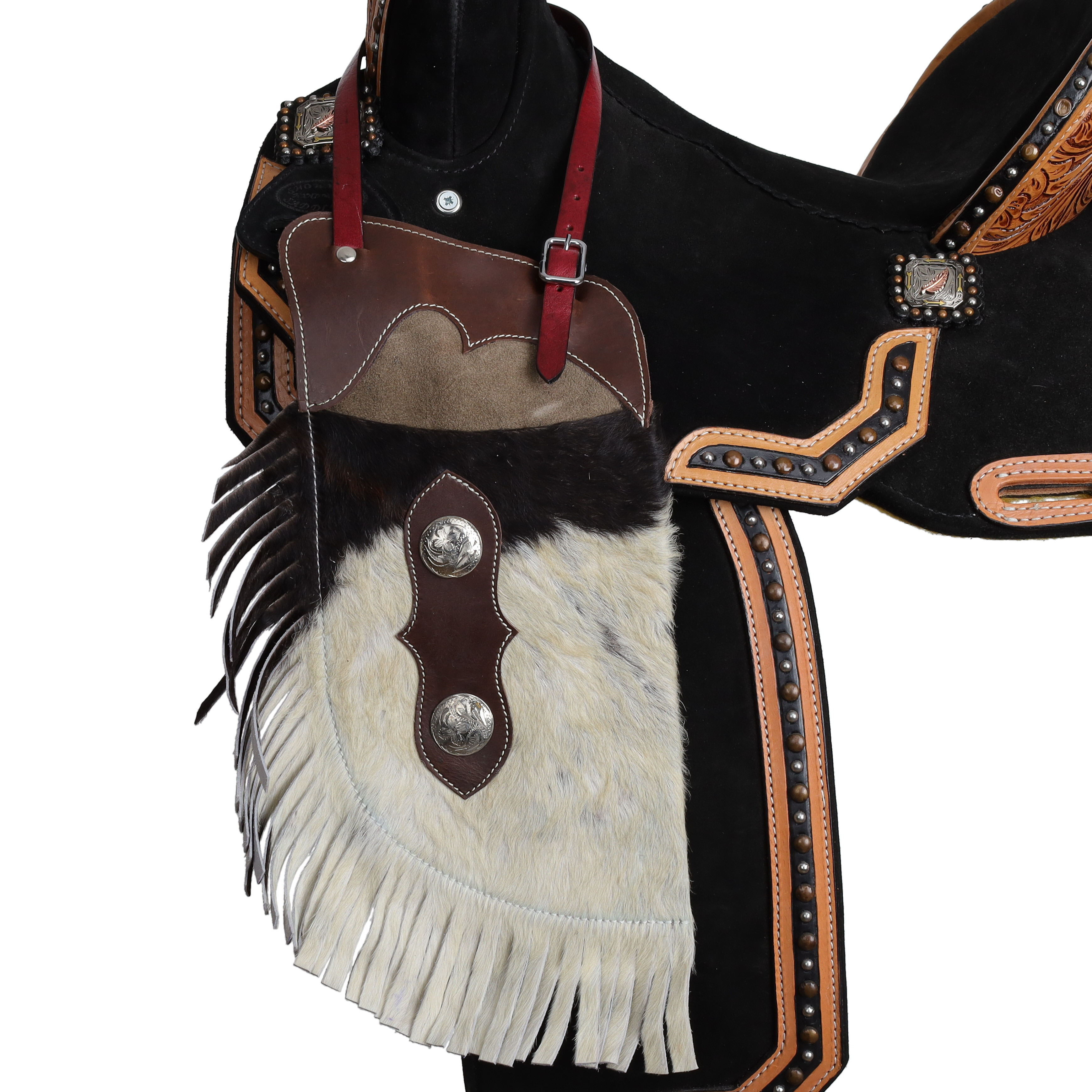The Showman® Ranchhand Horn Bag combines rugged western style with practical functionality. Crafted from rich chocolate leather and accented with chocolate leather and hair-on cowhide overlays, this horn bag features silver engraved conchos for a distinctive, classic western look. Its western chink shape allows it to easily hang over your saddle horn or thread through your pommel for convenient access while riding.