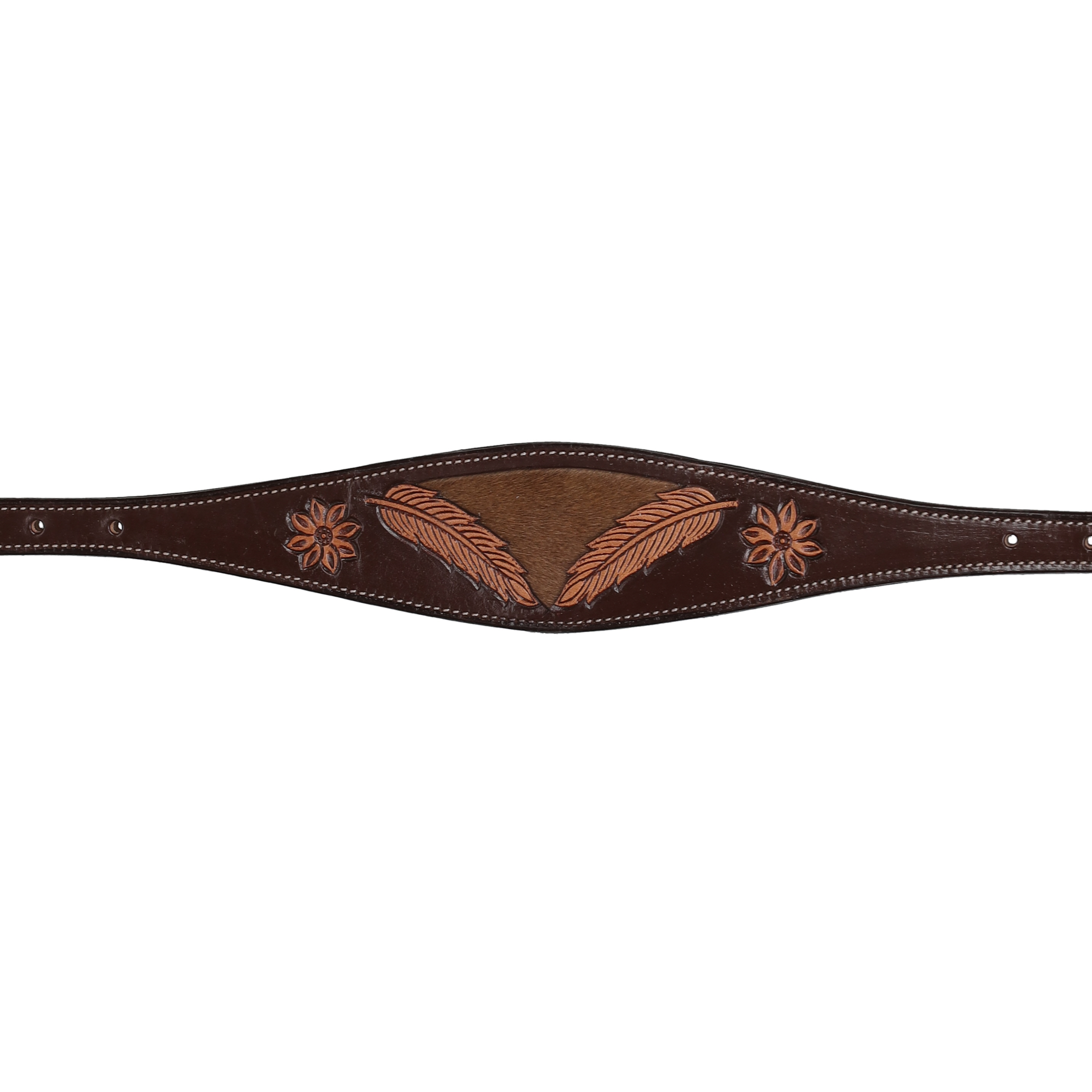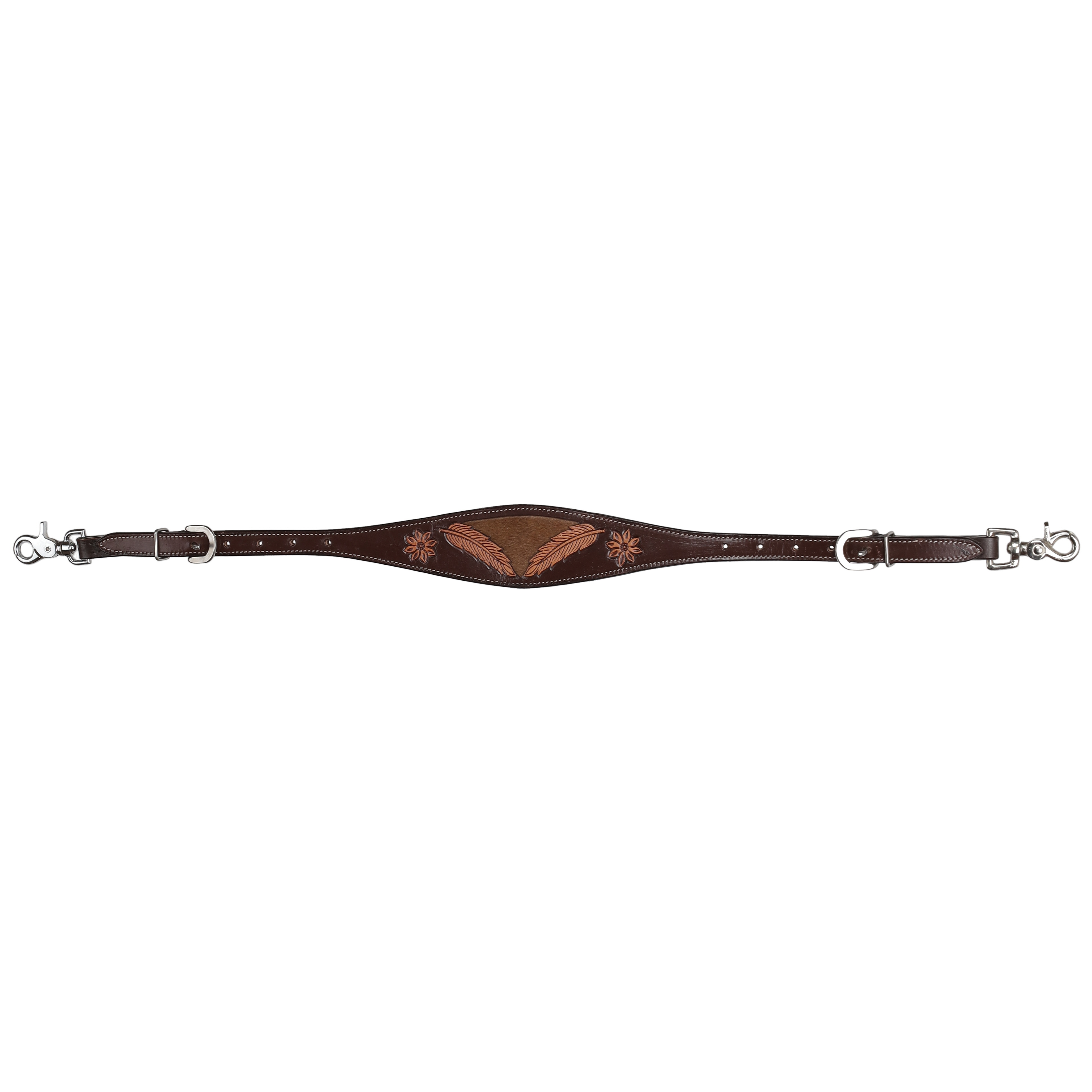 Add both function and signature Western style to your tack with the Showman® Raven Hide Wither Strap. Crafted from rich chocolate oiled leather, this wither strap features beautifully detailed feather and flower tooling paired with a bold cowhide inlay for a rugged yet refined look that perfectly complements the Raven Hide collection.