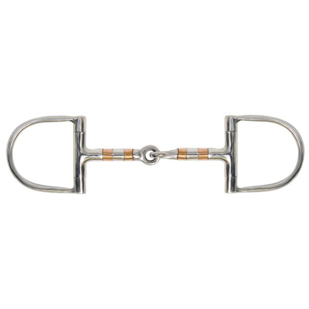 This versatile and stylish bit is a stainless-steel racing D-ring style bit that features a 5-inch copper broken mouthpiece and 3-inch D-cheeks. This bit is designed to provide effective communication between rider and horse. The D-ring design helps to prevent the bit from sliding through the horse's mouth. This D-ring design provides gentle control and allows the rider to communicate with their horse effectively.