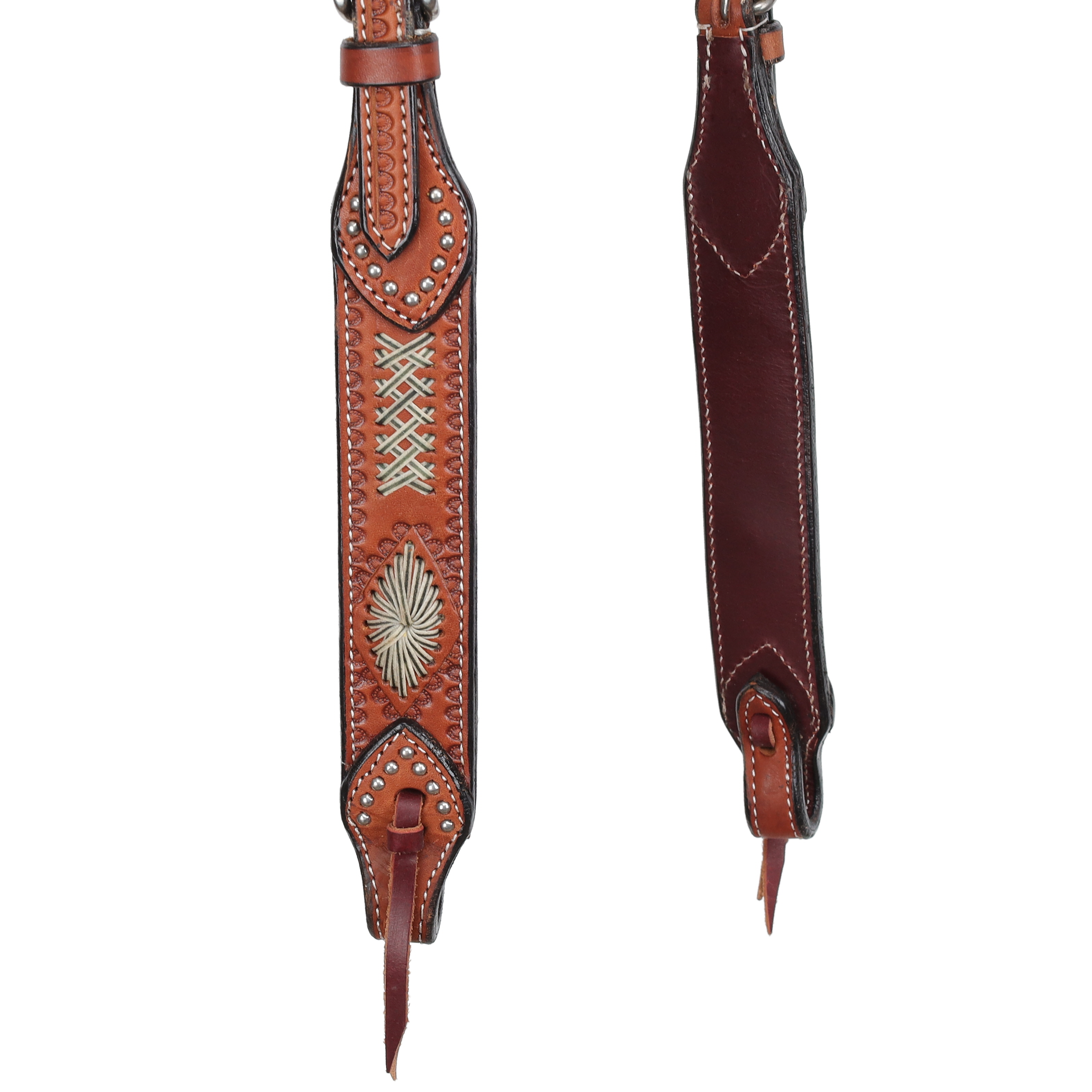 Showman ® Argentina cow leather single ear headstall with rawhide inlay design. This headstall features medium colored Argentina cow leather with rawhide on ear piece and cheeks. Reins not included. Hardware is Stainless Steel.