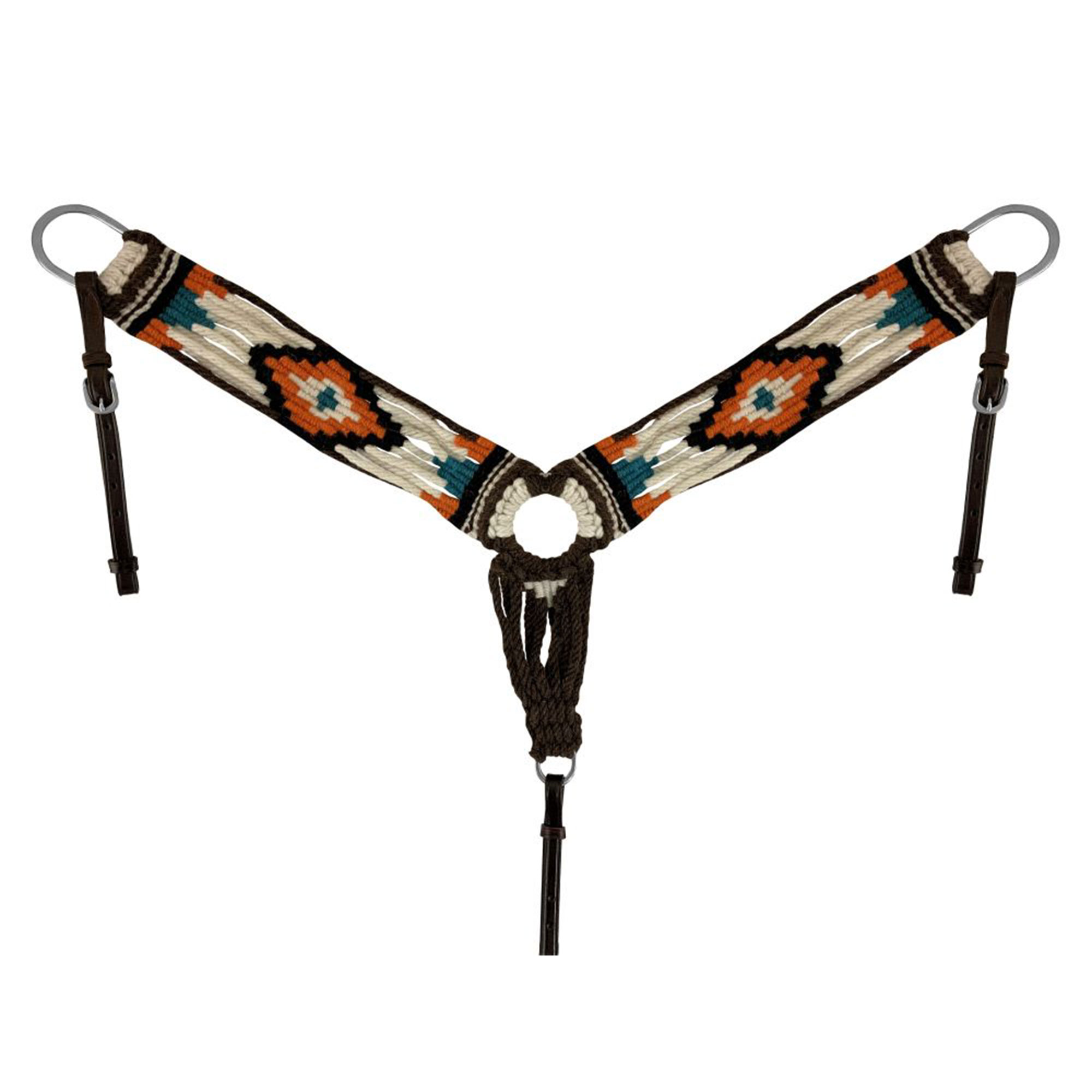Featuring a white, orange, turquoise, and black woven wool design, this breastcollar adds a vibrant pop of color with a touch of traditional western flair. The soft yet sturdy material ensures both comfort for your horse and durability for long-lasting use.