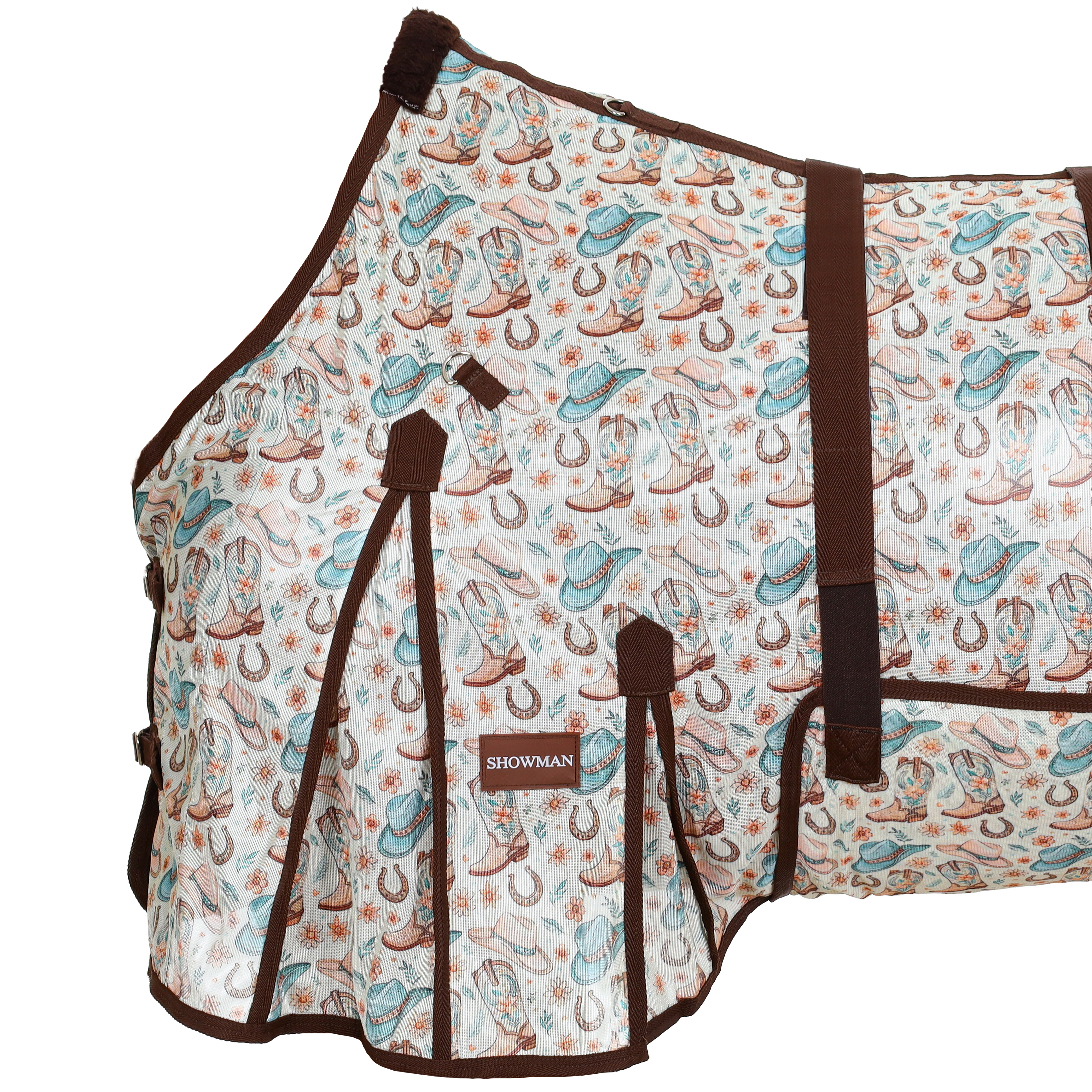 Saddle up your horse in fun, fashionable protection with the Showman® Western Whimsy Fly Sheet! This eye-catching fly sheet features a playful Western-themed print bursting with cowboy boots, cowboy hats, horseshoes, and more — bringing a smile to the barn while keeping your horse comfortable and stylish all day long.