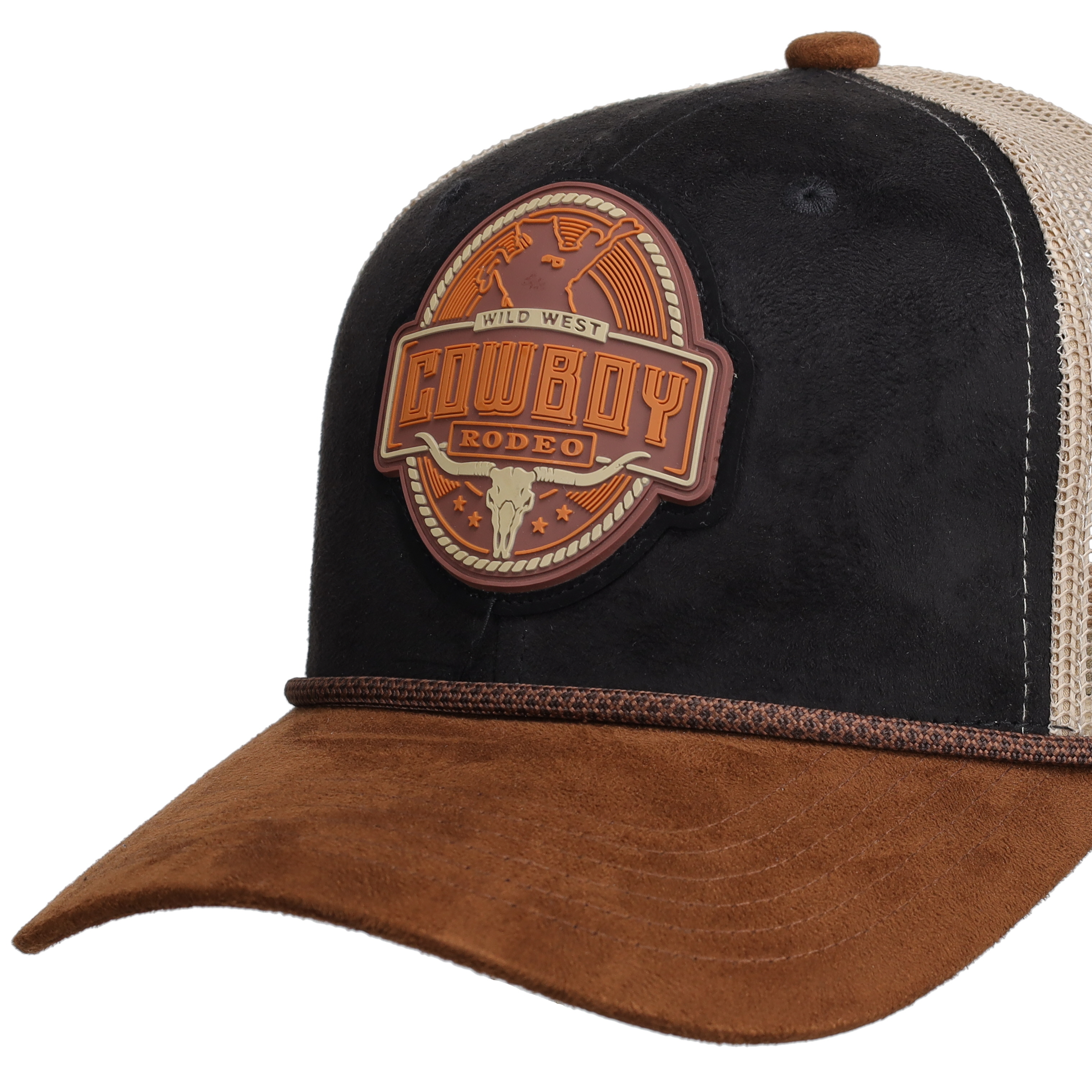 Featuring a black suede front panel with a khaki mesh back for breathability, this cap is designed for comfort and durability. The brown suede bill adds a touch of rustic charm, perfectly complementing the brown, orange, and tan “Wild West Cowboy Rodeo” patch that showcases a cowboy rider and steer skull design.