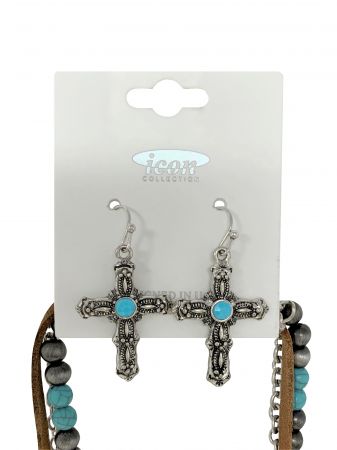 Turquoise cross earring and necklace set. This leather beaded necklace features a selection of multi sized cross accent charms with silver and turquoise bead accents. Comes complete with matching hook earrings.