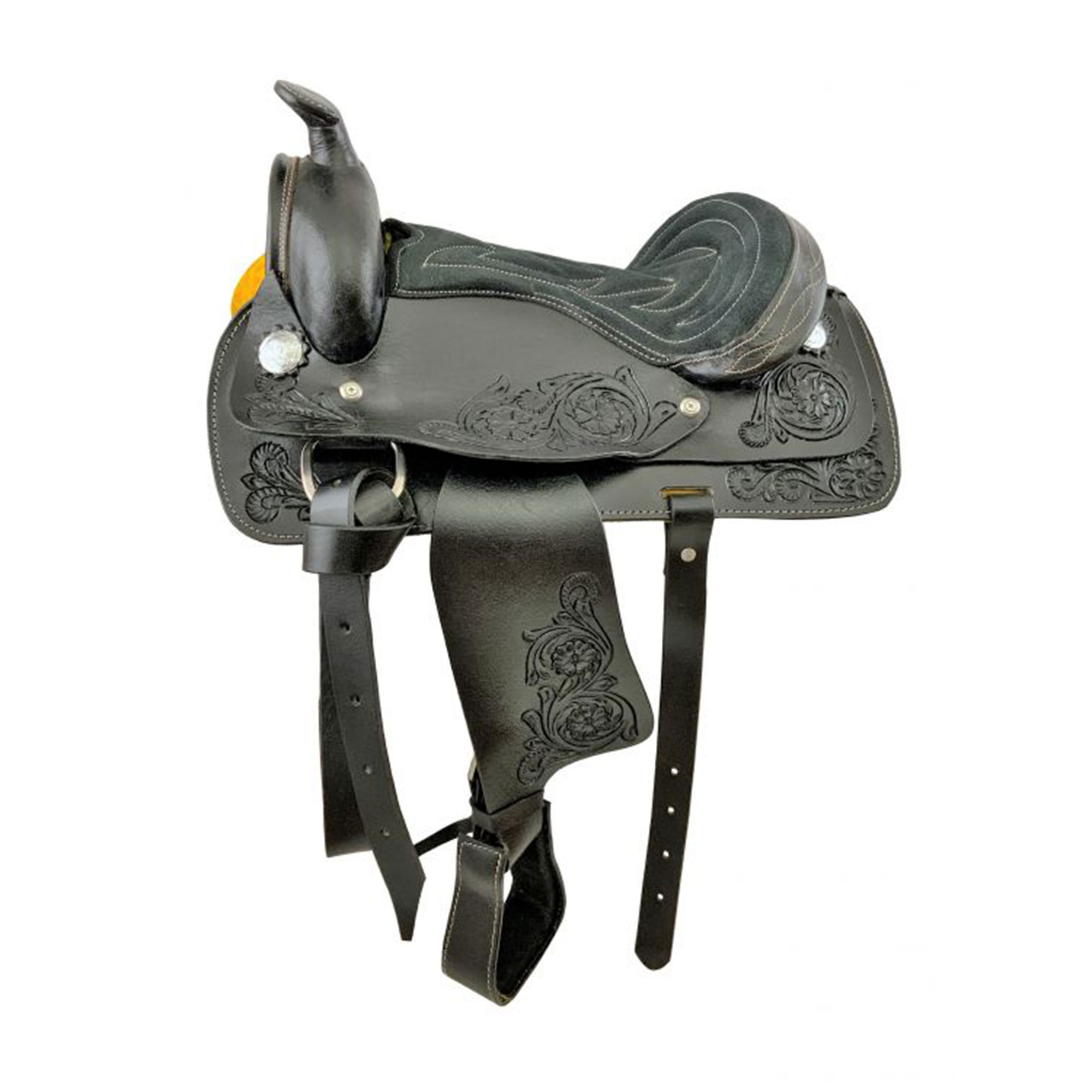 The Youth Western Pony Saddle with Floral Tooling is the perfect combination of style, comfort, and durability for young riders. Crafted from quality medium or black oiled leather, this saddle features beautiful floral tooling that adds a classic western touch. The black suede stitched seat offers comfort and security, making it ideal for little riders who are learning or riding daily.