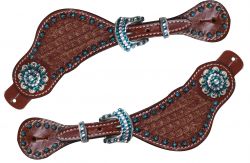 Showman Ladies size Basket weave tooled spur straps accented with teal crystal rhinestone conchos and studs